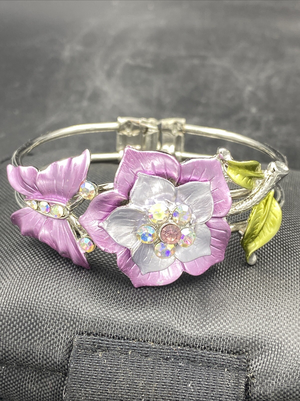 Add a touch of vintage charm to your jewelry collection with this lovely bangle bracelet. The multicolor butterfly and flower design on a silver tone base makes this bracelet a perfect addition to any outfit. The bracelet is made of mixed materials and features flower and butterfly with rhinestones. This original piece is perfect for women who love fashion and appreciate the beauty of vintage jewelry. The bracelet is not signed and the base metal is unknown. Add this lovely piece to your collection today and enjoy its timeless elegance.