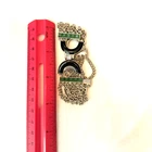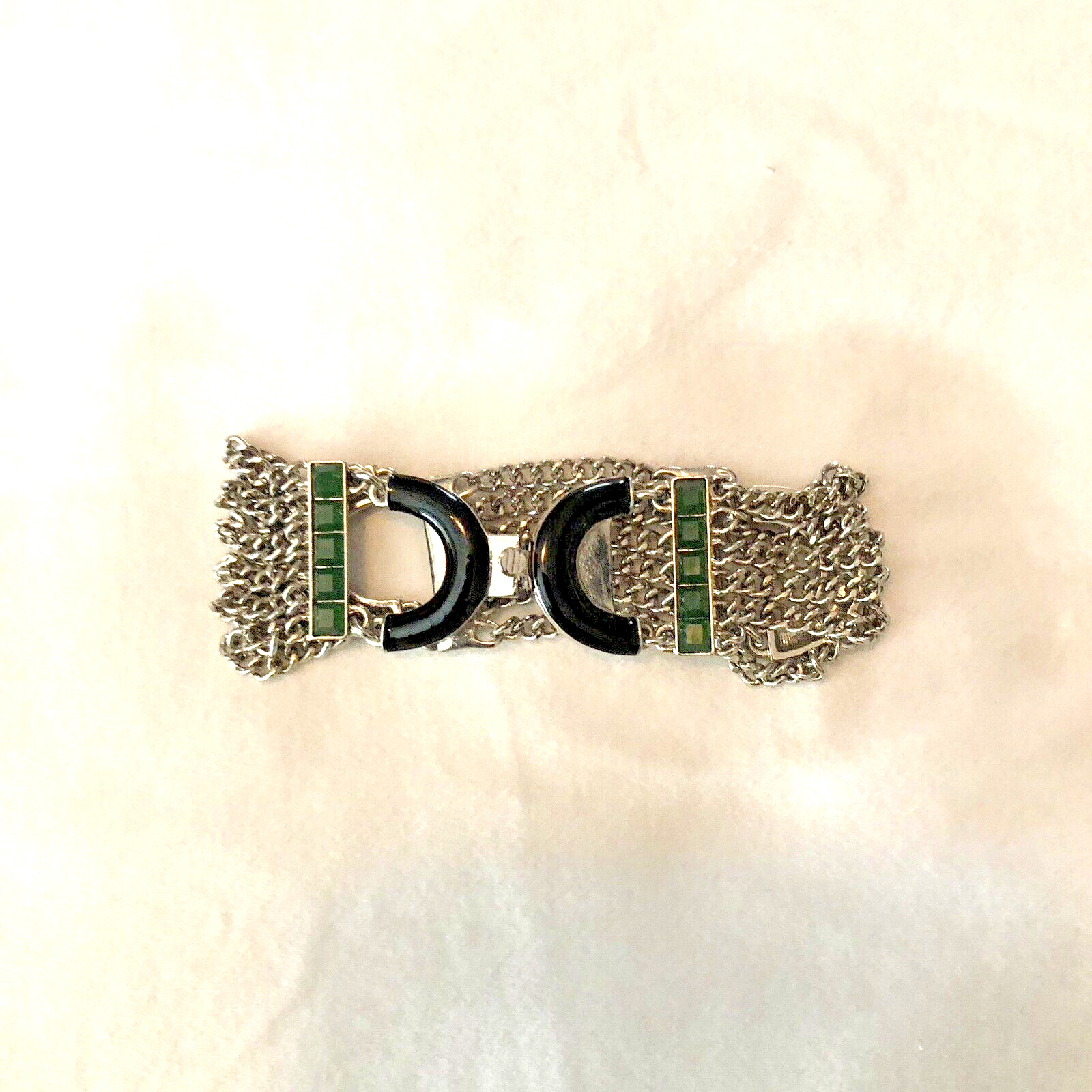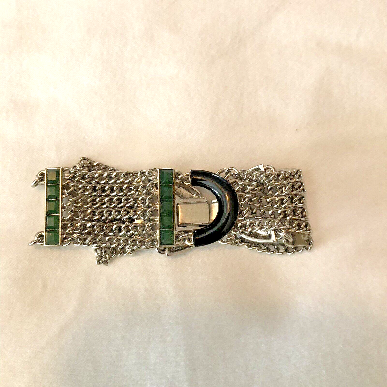 Silvertoned, black and green 6” chain bracelet, faux jade, onyx and emerald look, Preowned excellent condition, dust jacket included