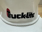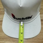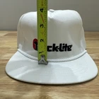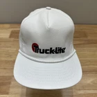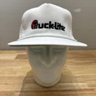 Vintage Solid White Truck-lite Ball Cap With Metal Buckle Tuck In Strap Closure Made in USA by swingster. Clean and in great condition on the outside. The inside is spotless except for a few small spots on the headband. The metal buckle on the back strap has two golf clubs crossed with a golf ball in the middle.