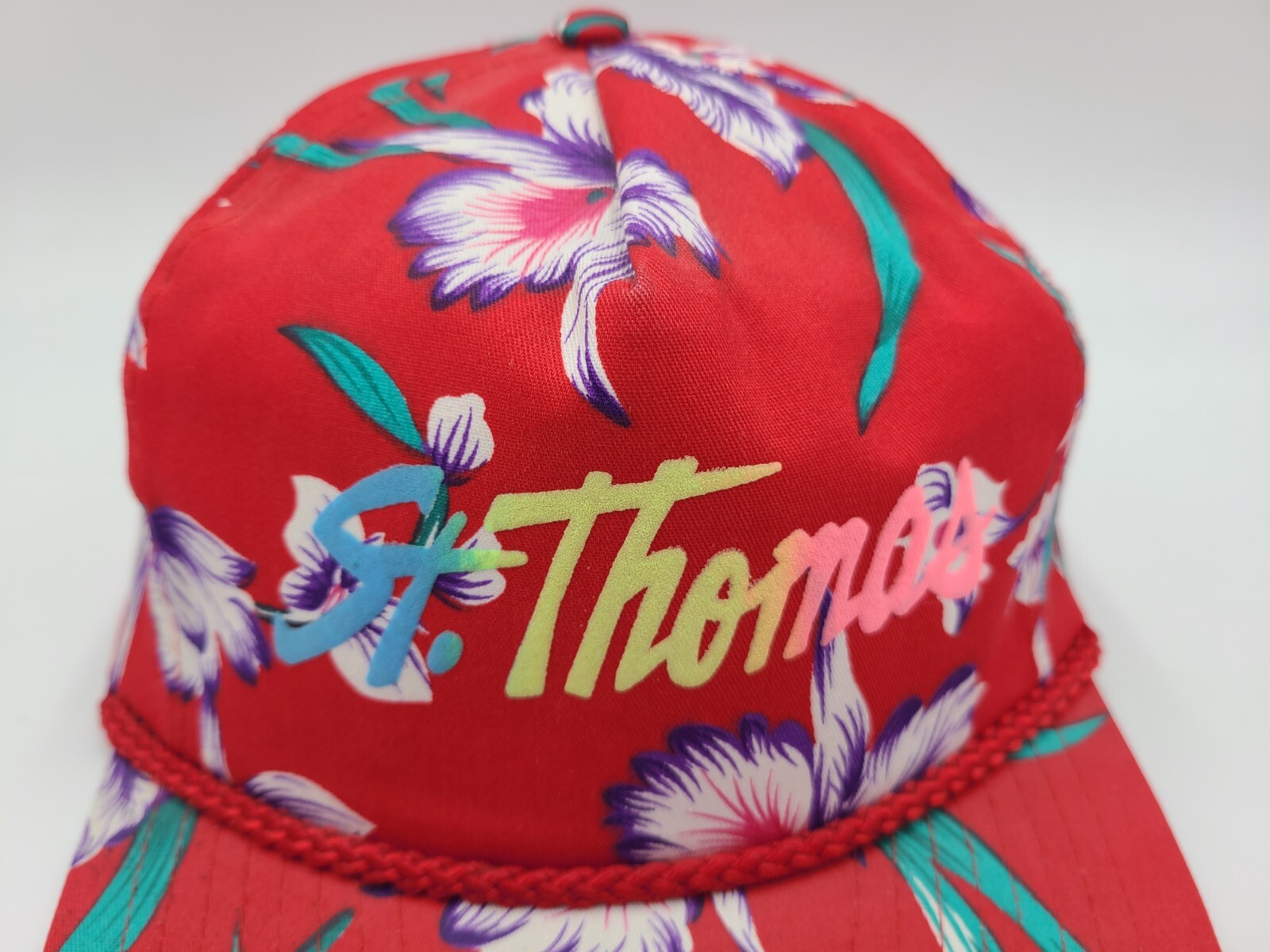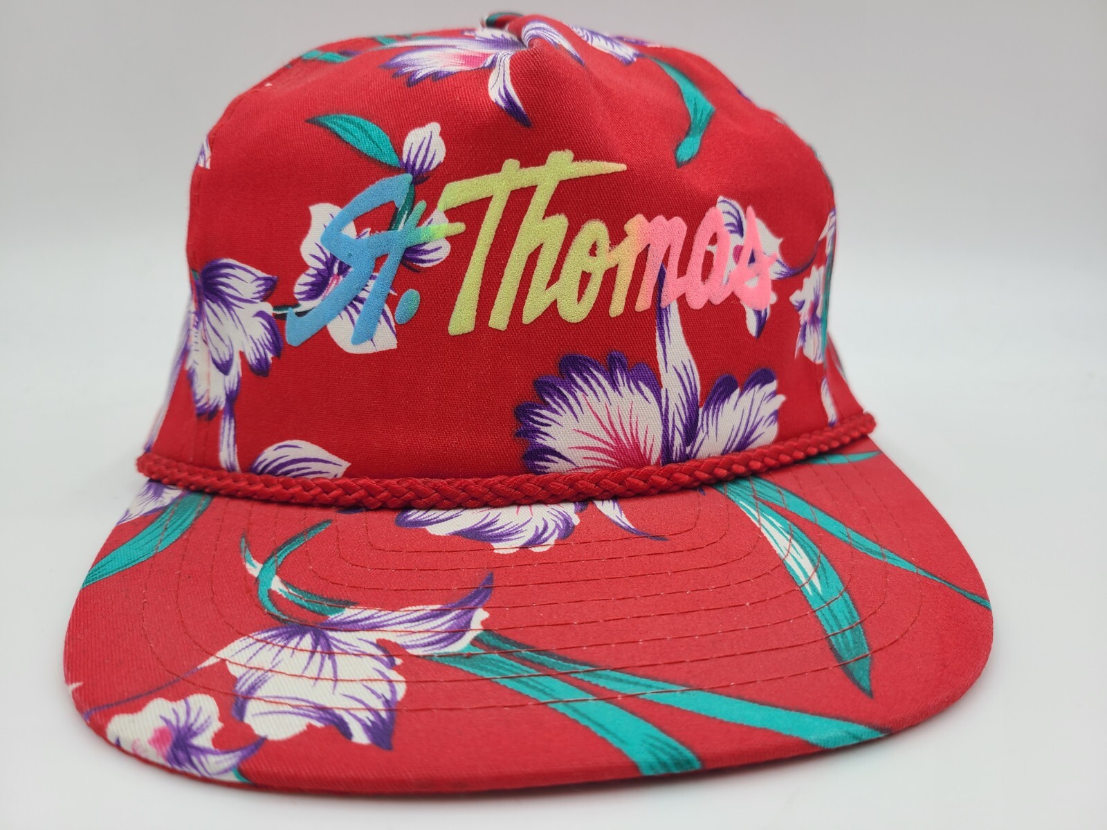 Has some stains on the brim, front, and sides as seen in photos. Vintage St Thomas Floral Snapback Hat Cap Travel Souvenir Island Men Women Red. EACH ADDITIONAL HAT PURCHASED IS ONLY $1 ADDED SHIPPING!