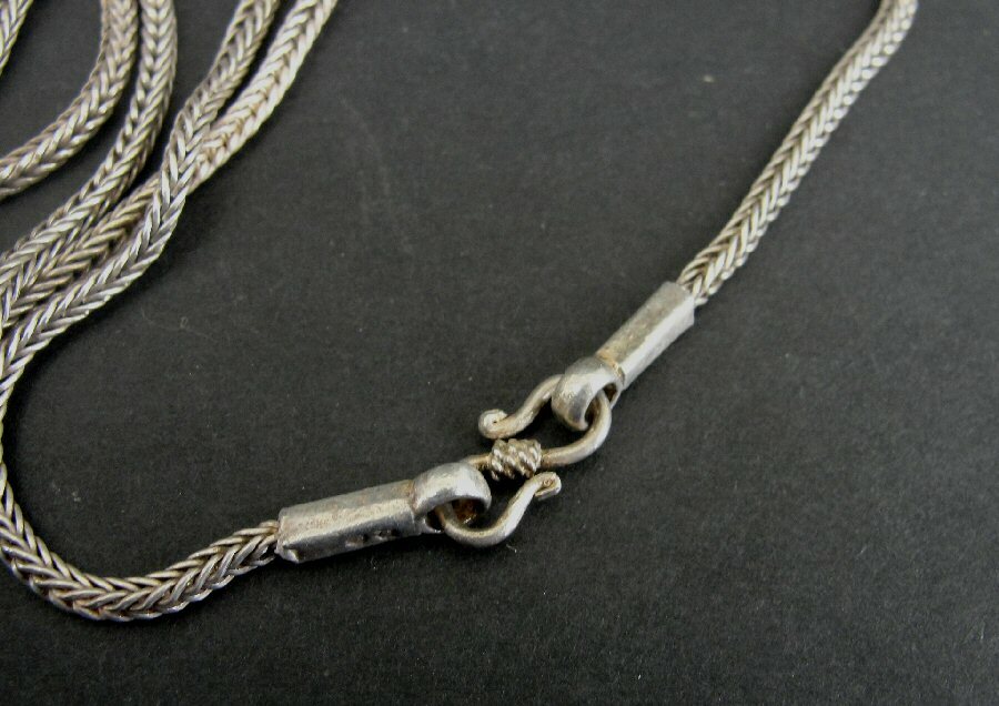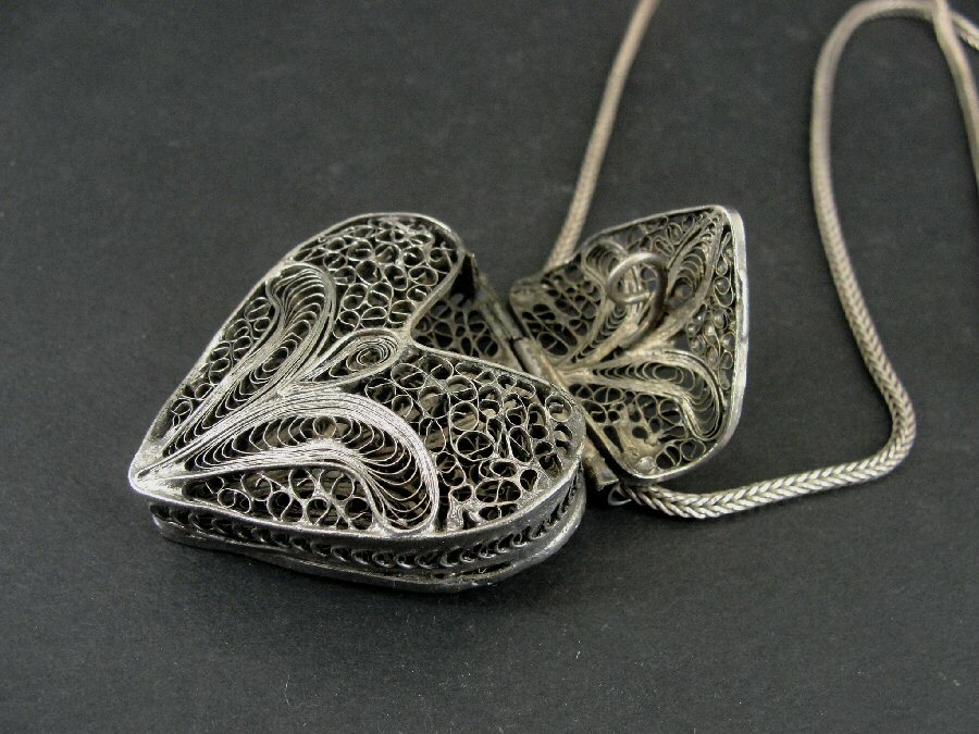 in nice vintage condition unmarked tests silver chain measures 28 1/2" long I believe this is a scent locket spun silver design snaps shut tight pendant locket measures 1 3/4" long including bales has not been polished we test all our silver items thanks, insurance optional WS29