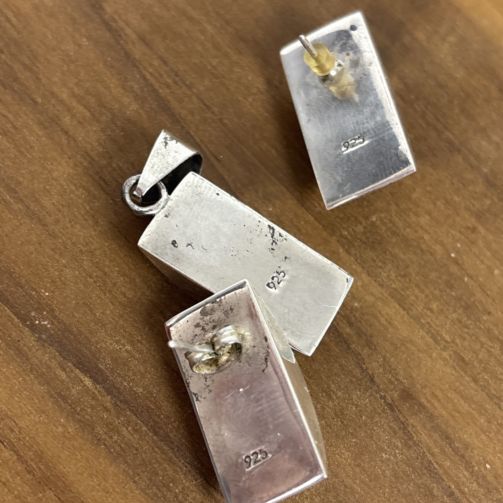 This vintage sterling silver pendant and earring set features a stunning sapphire stone as the main focal point. The pendant, in a statement style, is intricately designed with a traditional sterling silver setting, adding a touch of elegance and sophistication to any outfit. The set is perfect for those who appreciate unique, timeless pieces that showcase a beautiful blue sapphire stone in a classic yet stylish design. Includes 3 pcs sterling with blue stone unbranded, needs cleaning, missing backing on one earring