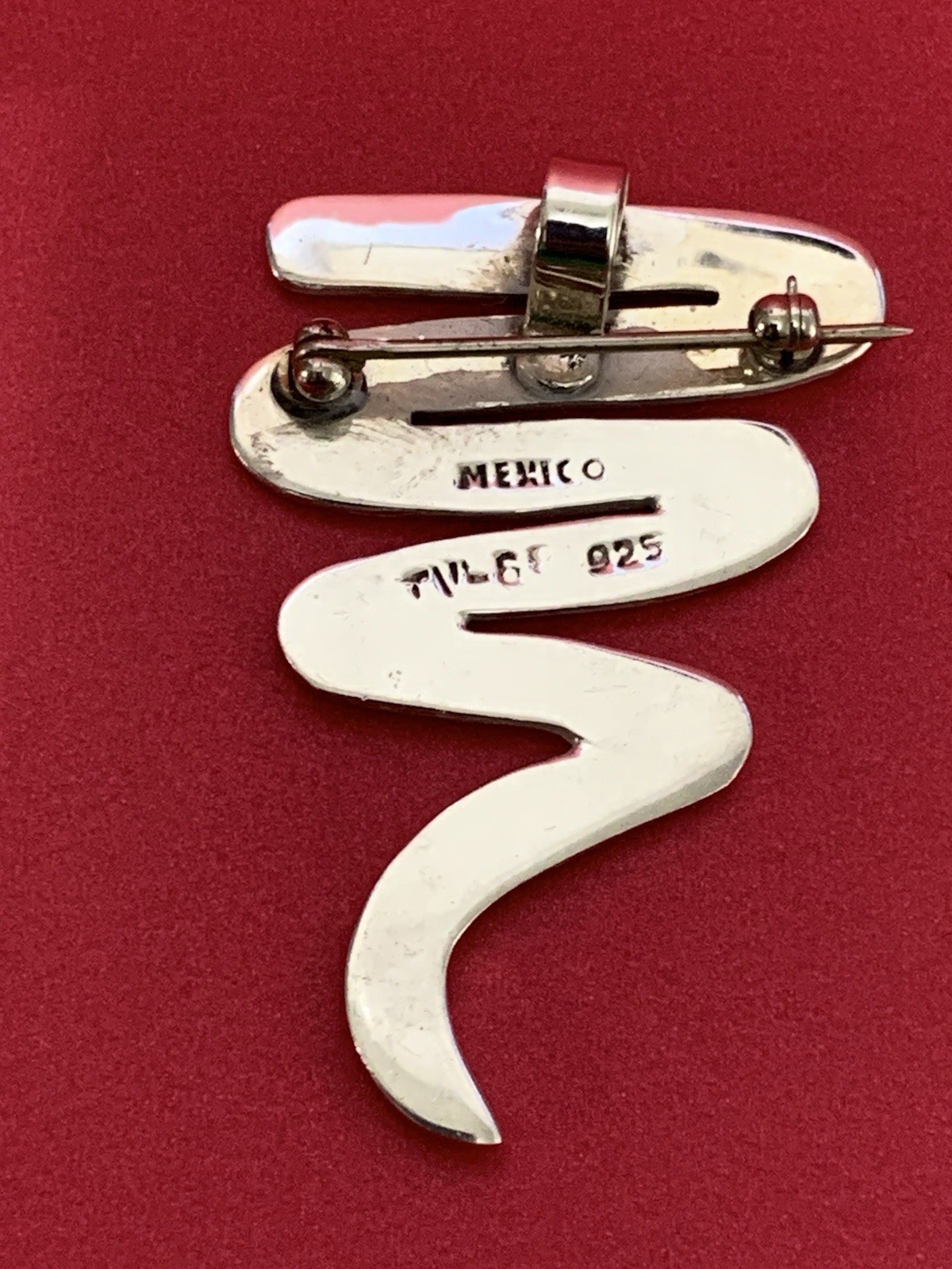 The Vintage Sterling Silver Zig Zag Brooch or pendant from Taxco, Mexico is a statement jewelry piece with an asymmetrical shape, signed by the maker. Made of 925 sterling silver, this original piece dates back to the 1980s, showcasing the quality craftsmanship and unique design of Mexican jewelry. The brooch features intricate details and a classic silver color, making it a versatile and timeless accessory for any unisex adults looking to add a touch of vintage charm to their outfit. 9.4 g of 925 silver