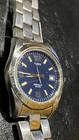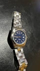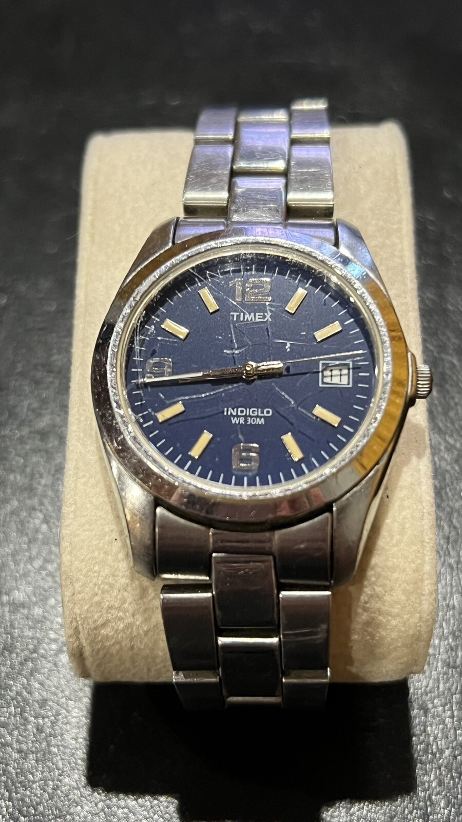 Vintage Timex CR 2016 CELL analog quartz wristwatch features a classic round shape with a silver stainless steel case and blue dial. The watch is designed for men and has a working bracelet that ensures a comfortable fit. With a silver bezel and analog display, this watch is both stylish and functional. It is equipped with a quartz movement and features a 12-hour dial. Note the surface marks visible in photos. Please see all photos as they are part of the description