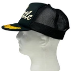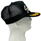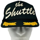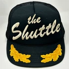 Vintage The Shuttle Trucker Hat Baseball Cap 80s Black Gold Scrambled Eggs Leaf Leaves Embroidered Embellishments Rope Roping Cord Cording San Sun Five Panel A-Frame Mesh Snapback Will be shipped in a box. Condition: Has spots and staining. No other flaws noticed. Has been cleaned and sanitized. See photos.