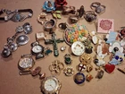 This vintage to modern mixed costume jewelry bulk lot includes a variety of pieces such as earrings, necklaces, bracelets, pendants, and brooches, all in a multicolor palette. The lot features brands like Louis Jourdan, Eddie Bauer, De Juno, Field Ranger, W.M.A Rogers, and Geneva, making it a unique and diverse collection suitable for unisex adults. The jewelry is made with mixed metals and includes over 50 pieces, making it a wonderful addition to any fashion jewelry department. Sold as is.