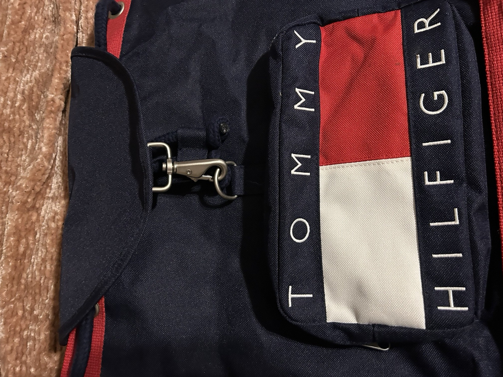 Vintage Tommy Hilfiger Canvas Big Logo Backpack Bag is a classic piece that exudes style and practicality. This blue, red, and white backpack is made of durable canvas material and features a solid pattern with the iconic Tommy Hilfiger logo. It has adjustable straps, a drawstring closure, and a front pouch pocket that zips, providing ample space for all your essentials. The backpack is eco-friendly and has a key clip for added convenience.