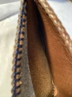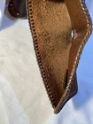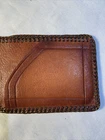 This vintage bifold wallet is a unique and handmade piece that features tooled leather with intricate horse and plant scenes. The wallet has a classic design with accents of lacing and a billfold for practical use. Made with high-quality leather, this wallet has a rich brown color that adds to its western theme. Measuring at 9 inches in length and 3.5 inches in width, this wallet is perfect for men who appreciate the craftsmanship of handmade goods. The wallet also has multiple features, including a pattern of animal print, making it a great addition to any collection. See photos for more details