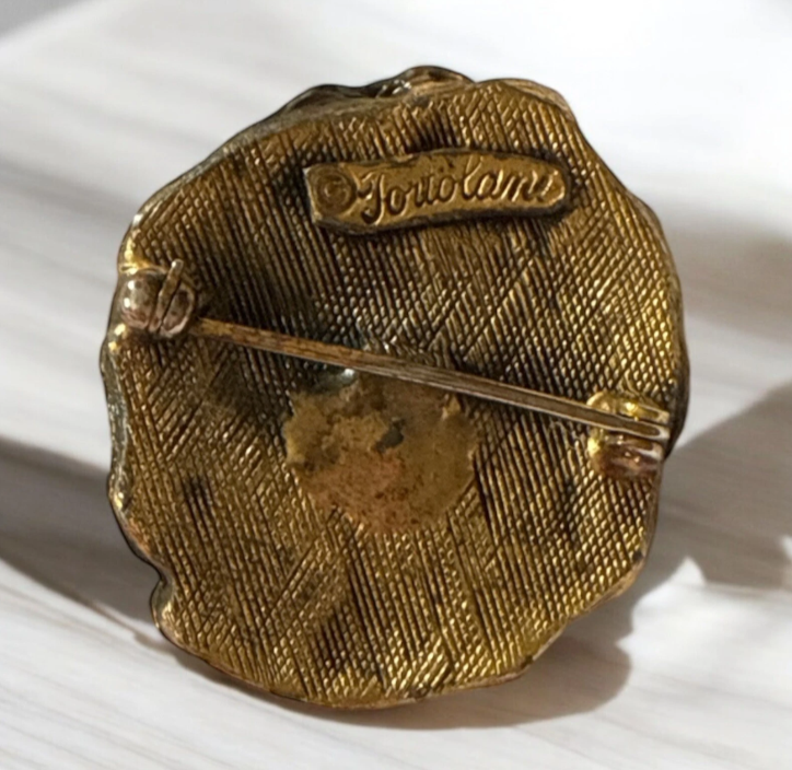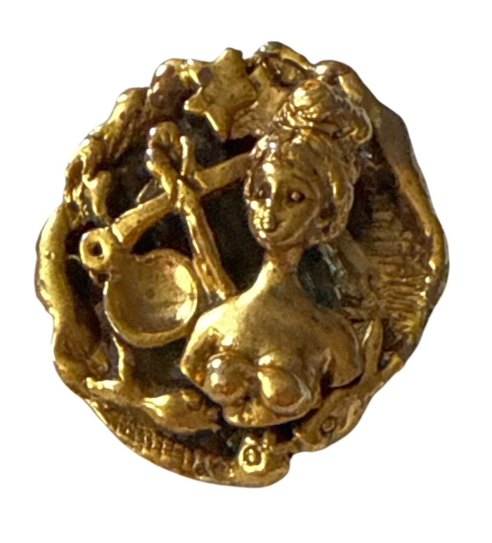 This vintage Tortolani brooch features a gold tone design with a figural angel motif, making it a unique and stylish accessory. The brooch is signed by the brand and showcases a round crystal as the main stone in a matching gold color. With its original and authentic design, this fashionable piece would be a standout addition to any unisex adult's jewelry collection, perfect for those who appreciate antique and vintage jewelry items. Depicting a buxom young woman, scales of justice, and a fish. Apparently, part of the Zodiac line. Marked: "Tortolani". Earring measures 1 1/8 inches by 1 1/4 inches. Excellent condition. Please note I am a veteran seller of 17 years under (TheChic_SheShed) I opened this account to move my jewelry to, as I closed my etsy shop. So please do not mind the little to no feedback. Check out my other account.