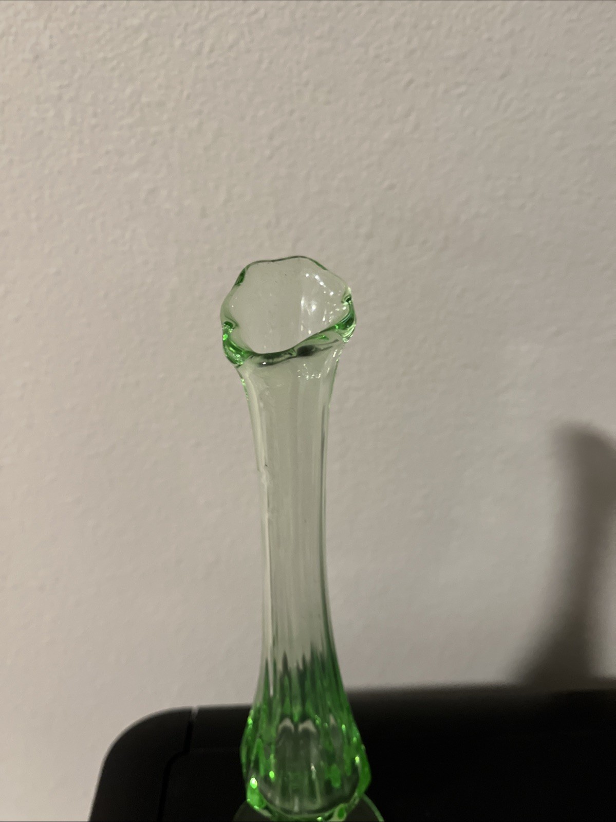 This product is a vintage Uranium Green Glass Swung Bud Vase with a fluted lip, standing at 8 inches tall. It is a rare piece from the early 20th century, featuring a mid-century modern style and a unique glow due to its uranium content. Handmade and pressed in the 1930s, this vase is a stunning piece of abstract art that adds a touch of history and elegance to any decor.