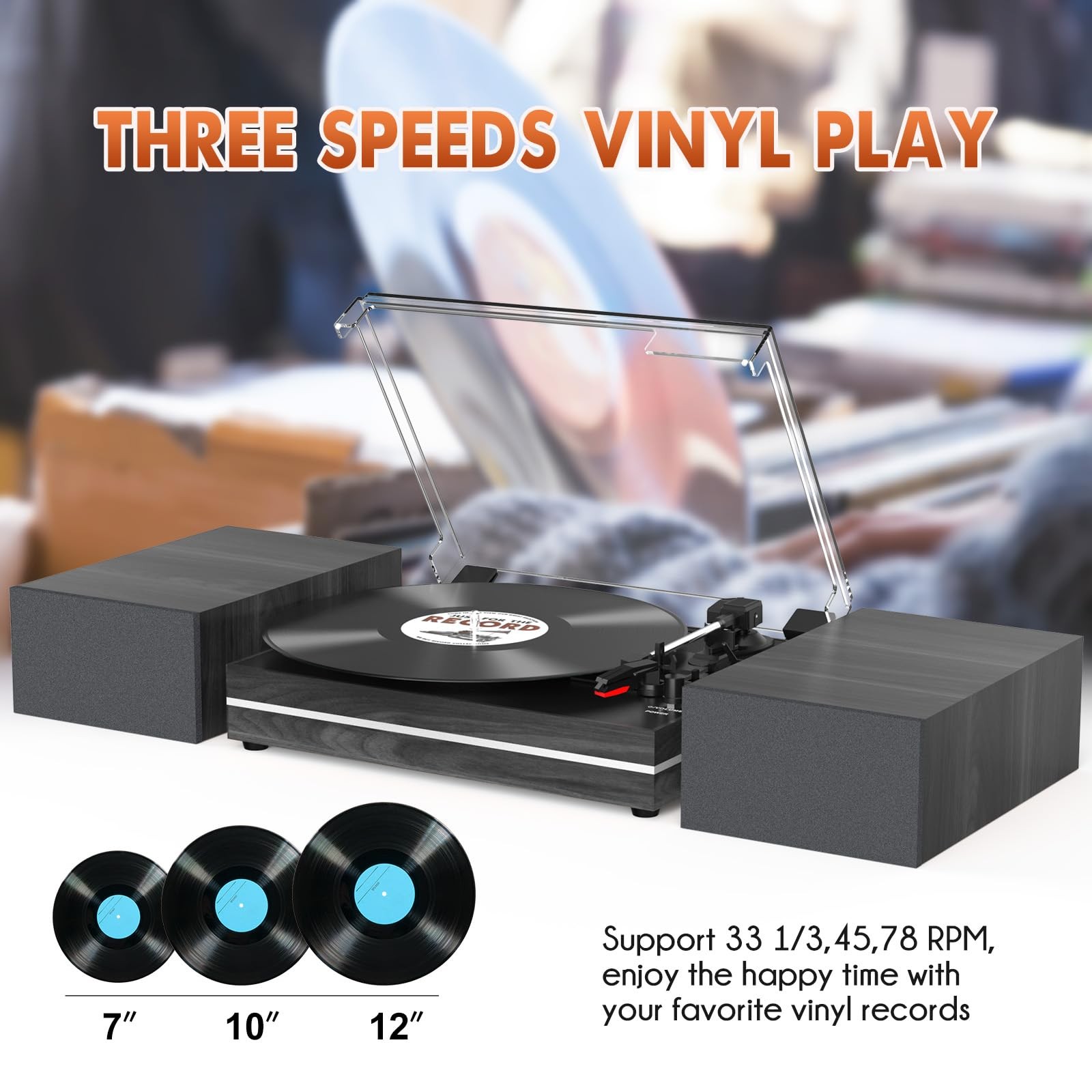 3-Speed Belt Drive Turntable The diamond-tipped stylus plays all of 33 1/3, 45, and 78 RPMs records. Auto-stop setting makes it possible to stop automatically when it reaches the end of the record. Supporting universal 3-size of 7/10/12 inches or any other size record. If needed, the 45 RPM adapter is included. Wireless BT Connection Streaming Built-in BT receiver lets you wirelessly connect to your mobile phone through sensitive and fast BT pairing and play any digital music you want. So you don’t need to worry either if you do not have enough vinyl records. Come with Two External Speakers The dual speakers will work for most people, so if you're a record player starter, this would be a good choice. You don't have to worry about not having extra speakers in your home. Vintage Audio Turntable Record Player The vinyl turntable with vintage wood appearance is equipped with a protective dust cover.The full covered protective dust cover would not affect the normal playback when you close it. Great Idea for Vinyl Lovers It creates a warm atmosphere when family gatherings. When you are alone, it can help you relax. Even if you don't use it, it can be one of the home's premium decorations. It also allows the recipient to feel your heart. RCA Line Output and AUX-IN Your turntable record players for vinyl with external speakers include both Phono and Line outputs that allow playing with or without a Phono equalizer. It also can play other devices’ music by wireless BT or using the Aux-in port. For better or louder sound, connect the external speaker with rca clip jack via an RCA clip cable. Two Dual Separable Speakers - Equipped with a separable pair of speakers, let you enjoy the full, real and live vinyl audio in dual speakers easily. Allow connection to the set of included speakers or to your own externally-powered speakers via the dual RCA output cables BT Wireless Input Streaming - Record player built-in BT receiver which can connect to your mobile phone wireless through sensitive and fast Bluetooth pairing and play music from all your favorite devices Vintage Style Looking Design - Enjoy your favorite vinyl with this vintage-looking turntable. The minimalism, retro design of this record player makes for a stunning and functional turntable. Dual powered bookshelf speakers allows for multiple placement options, and can be placed as a bookshelf or record shelf 3 Speed Belt Driven Systerm Turntable - Three speed record player play all of your 33⅓, 45, 78 RPM vinyl records(7", 10", 12" vinyls), 45 RPM adaptor included. Auto-stop function setting makes it possible to stop automatically when it reaches the end of the record, better protect your records Simple Setup and Operation - Great idea for a beginner. The AUX input port allow you to play mp3 music. Detachable hinged dust cover protects your record when not in use, and it would not affect the playback when you close it. A high-end vintage look, it will be a perfect choice for birthday and Christmas, especially for a music lover