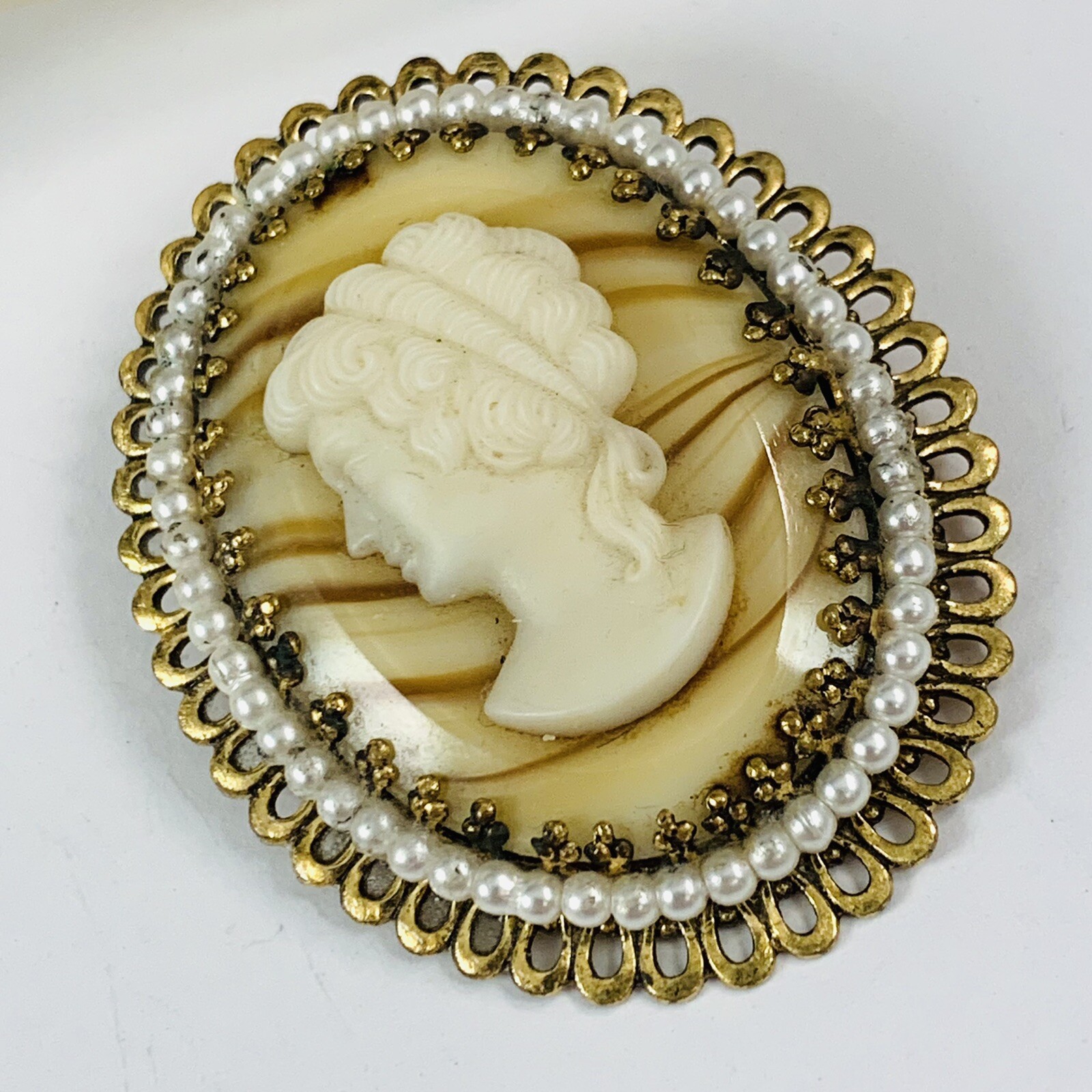 Vintage West Germany Glass Cameo Faux Pearl Gold Tone Brooch. Piece does show some finish wear on the back. Pre-Owned Vintage Estate Jewelry. Ready to wear, give as gift or add to a collection. Our Vintage items are mostly from estate sales and vary in age from 100+ years old to more modern pieces. Please use your judgement. Items are photographed on a measuring matte with one-inch squares to give you an idea of size. Any photography props / holders you see are not included.