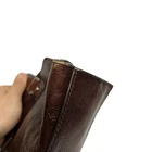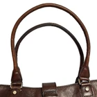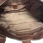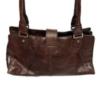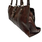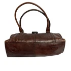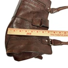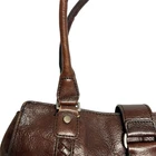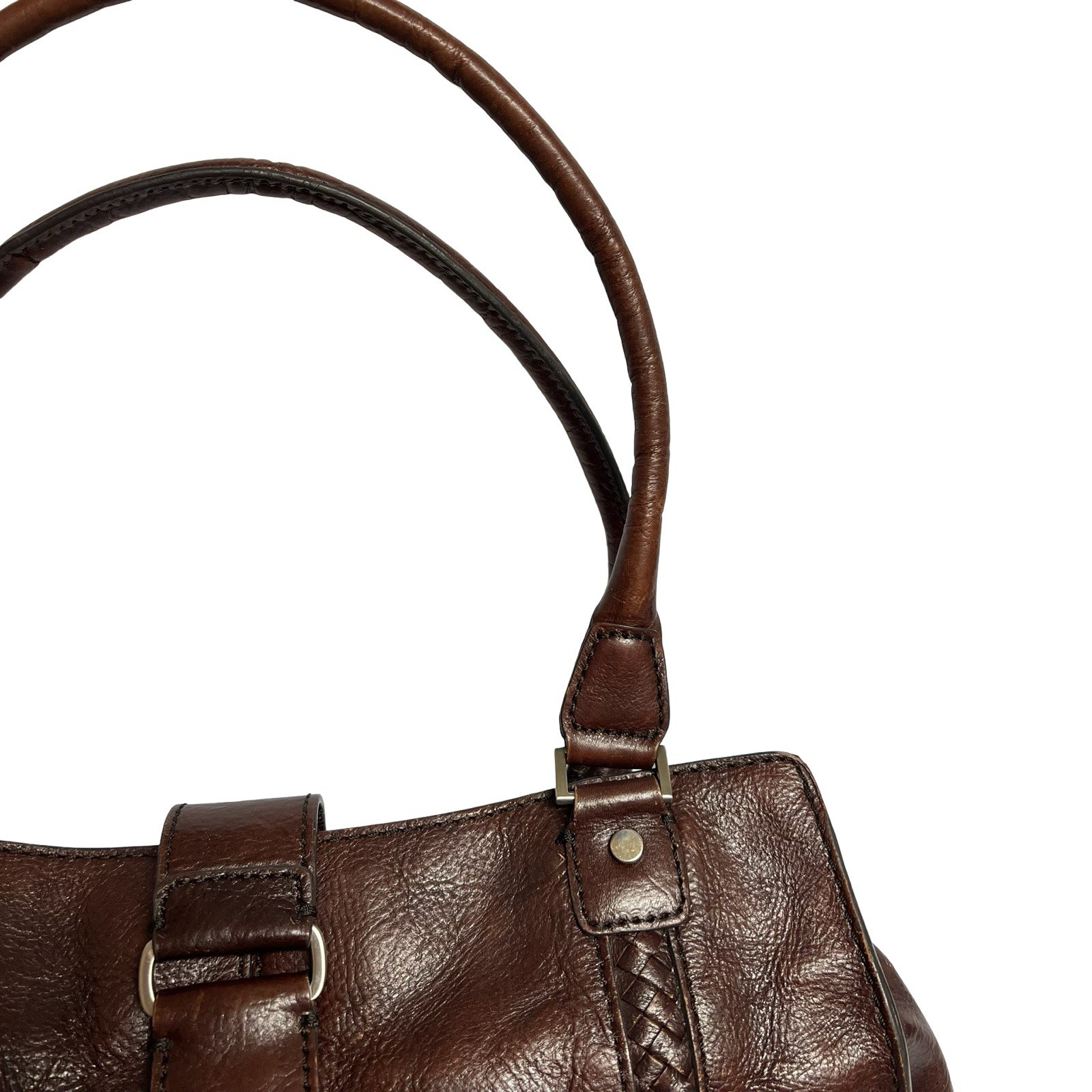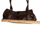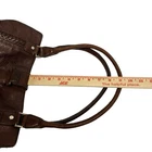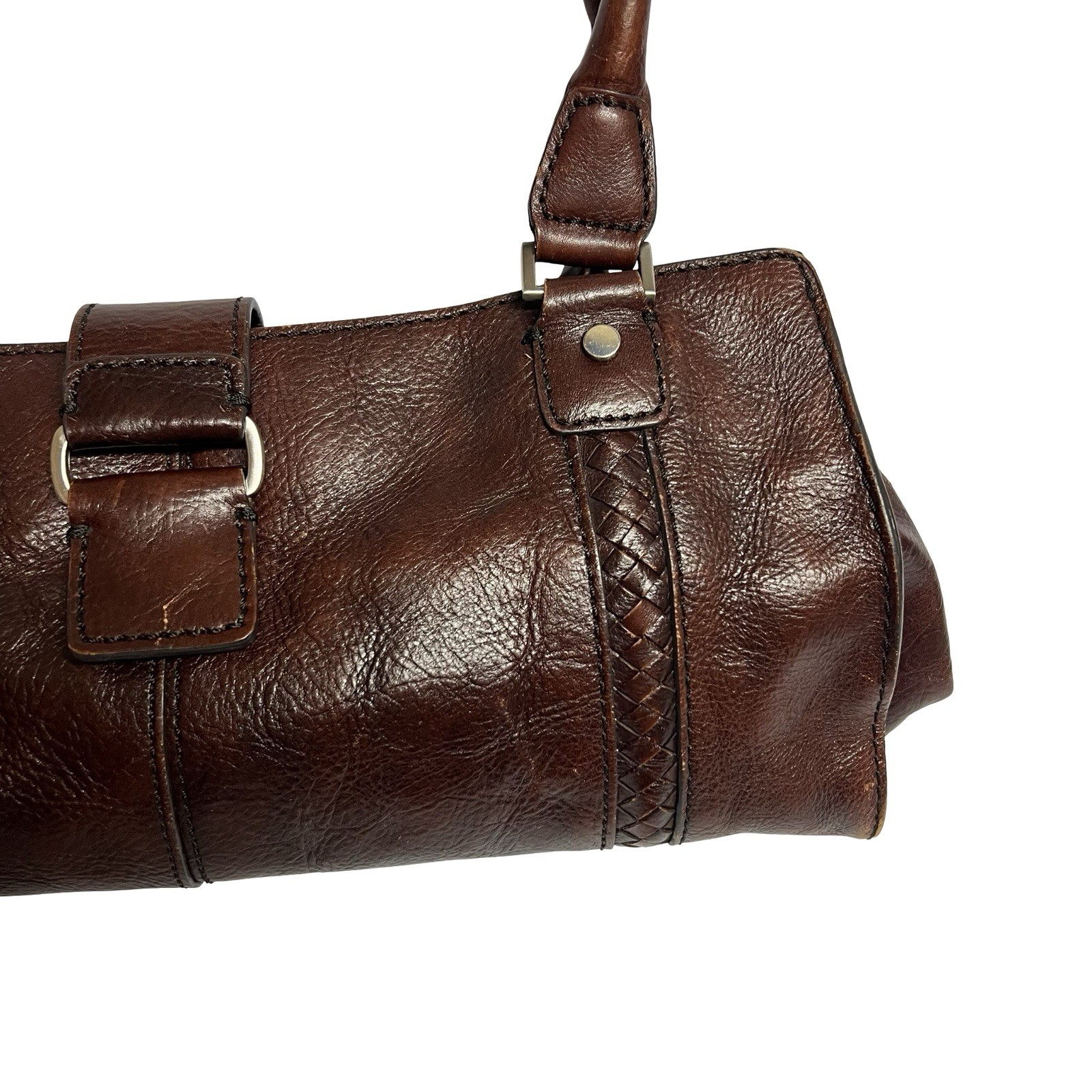 Wilson's leather shoulder bag with double rolled handles, braided trim, and front strap accent with magnetic closure. Color: Brown leather with silver-tone hardware and braided leather trim details. Size: Womens Small. Material and construction: Leather exterior with stitched panel construction, braided leather accent strips, leather-wrapped rolled handles, and silver-tone metal hardware. Exterior details: Barrel silhouette, front strap with magnetic closure, braided trim on both sides, and rivet accents at handle attachments. Features: Shoulder carry, braided trim, strap accent, magnetic closure, double rolled handles, silver-tone hardware. Additional notes: See photos for close-up views of the braided trim, stitching, hardware, and overall shape. Condition notes: See full condition description for details.