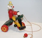 Vintage Wooden Clown on Tricycle Pull Toy Vintage Wooden Clown on Tricycle Pull Toy. It measures about 10 inches tall. Very Good condition. Rear wheels spin freely and make a clicking sound. The front wheel is stiff and doesn't turn well especially on smooth surfaces. ] My Policies: Winning bidder will receive an invoice after the end of the auction. Payment is required within 4 days of the close of the auction. NO local pickup. Returns accepted within 14 days if there was an error in the listing. International bidders please wait for an invoice before paying. The international shipping calculator isn't always accurate. . Import duties, taxes and charges are NOT INCLUDED in the item price or shipping charges. These charges are the buyer's responsibility. Please check with your country's customs office to determine what these additional costs will be prior to bidding / buying. These charges are normally collected by the delivering freight (shipping) company or when you pick the item up. Do not confuse them for additional shipping charges. We do not mark merchandise values below value or mark items as "gifts". US and International government regulations prohibit such behavior. Powered by SixBit's eCommerce Solution