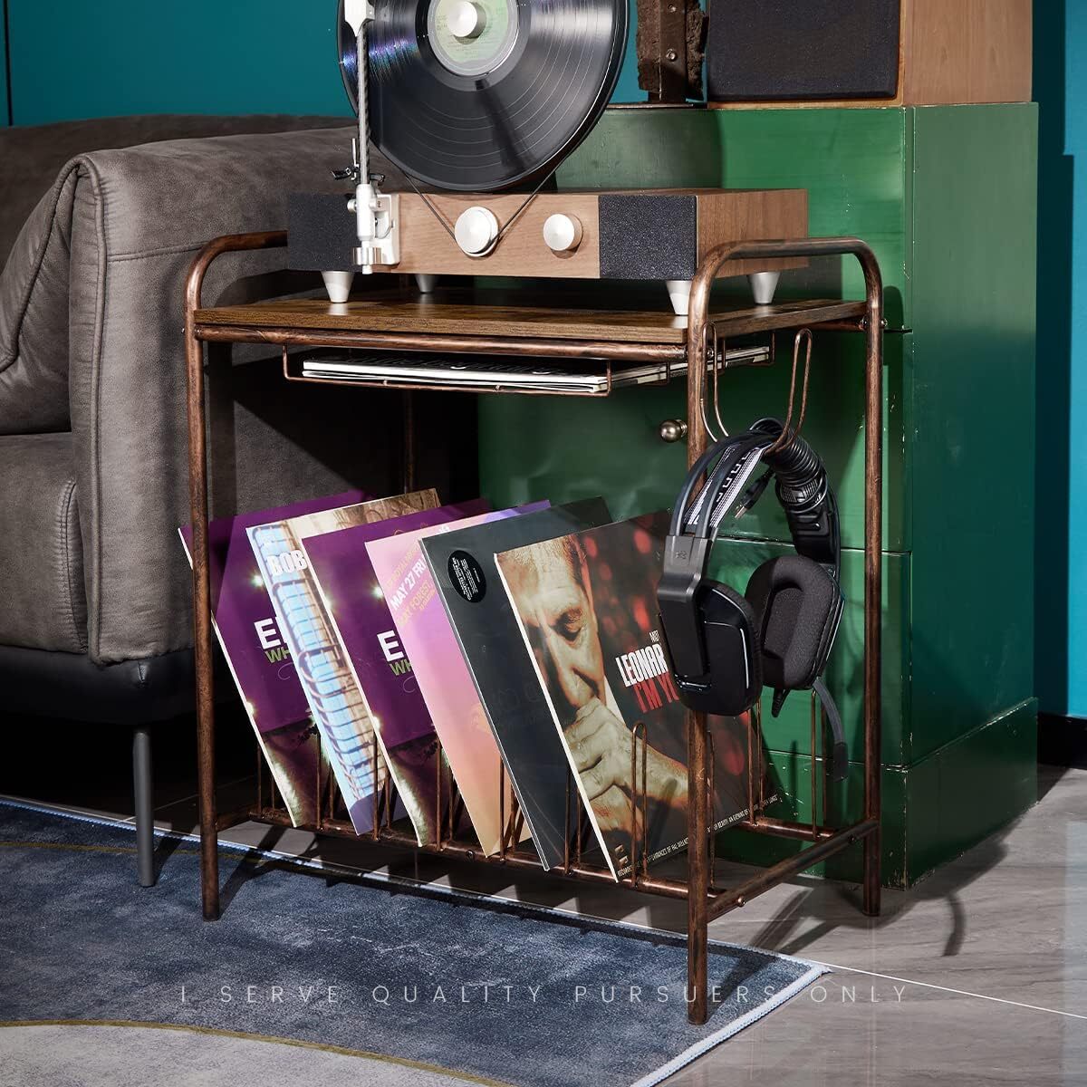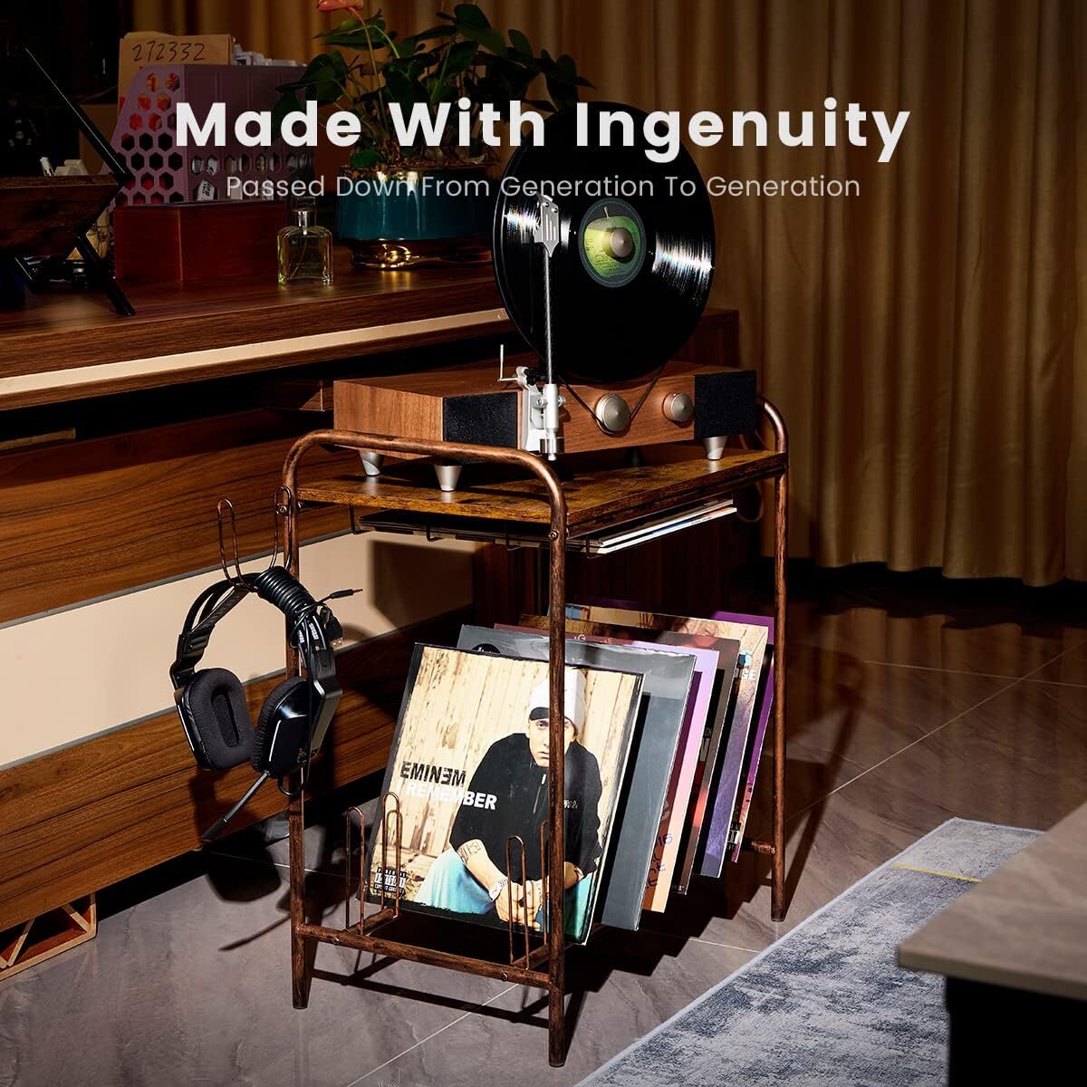 The lower space of this turntable rack can hold at least 80 records. The freedom to choose to place a stereo, speakers or 80 records means you don't have to worry about upgrading your equipment and the turntable stand no longer being compatible, it gives you more options. Easy to assemble Lightweight and simple design. It is very easy to install and the lightweight design is very easy to move.Reliable materials and great durability The Revival Series wants to meet all your personal needs for a turntable stand. If you are a beginner and happen to have a versatile record player, this product is the perfect choice for you. Incorporating classic hairpin legs and brown wood panels, the upper space is compatible with most record players. 2 levels of storage The lower space can hold at least 80 records, which means you can easily adjust and store the space.Multiple uses This versatile stand can be used not only as a table to store your record player, but also as an end table or nightstand or filing cabinet for your lamps, books, magazines, newspapers, home decor, records and more. It comes in a rustic brown color that blends in a of color schemes, combining rustic elements with a modern , and is a great decorative piece for your room in itself.