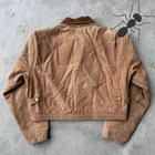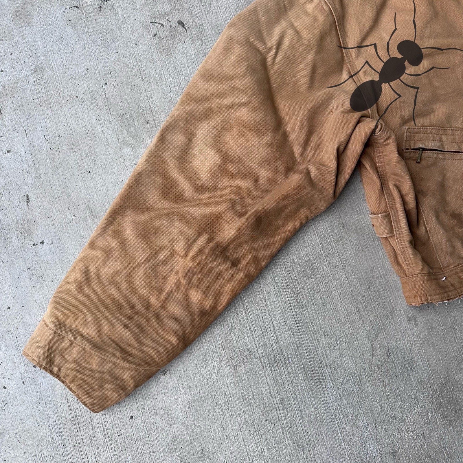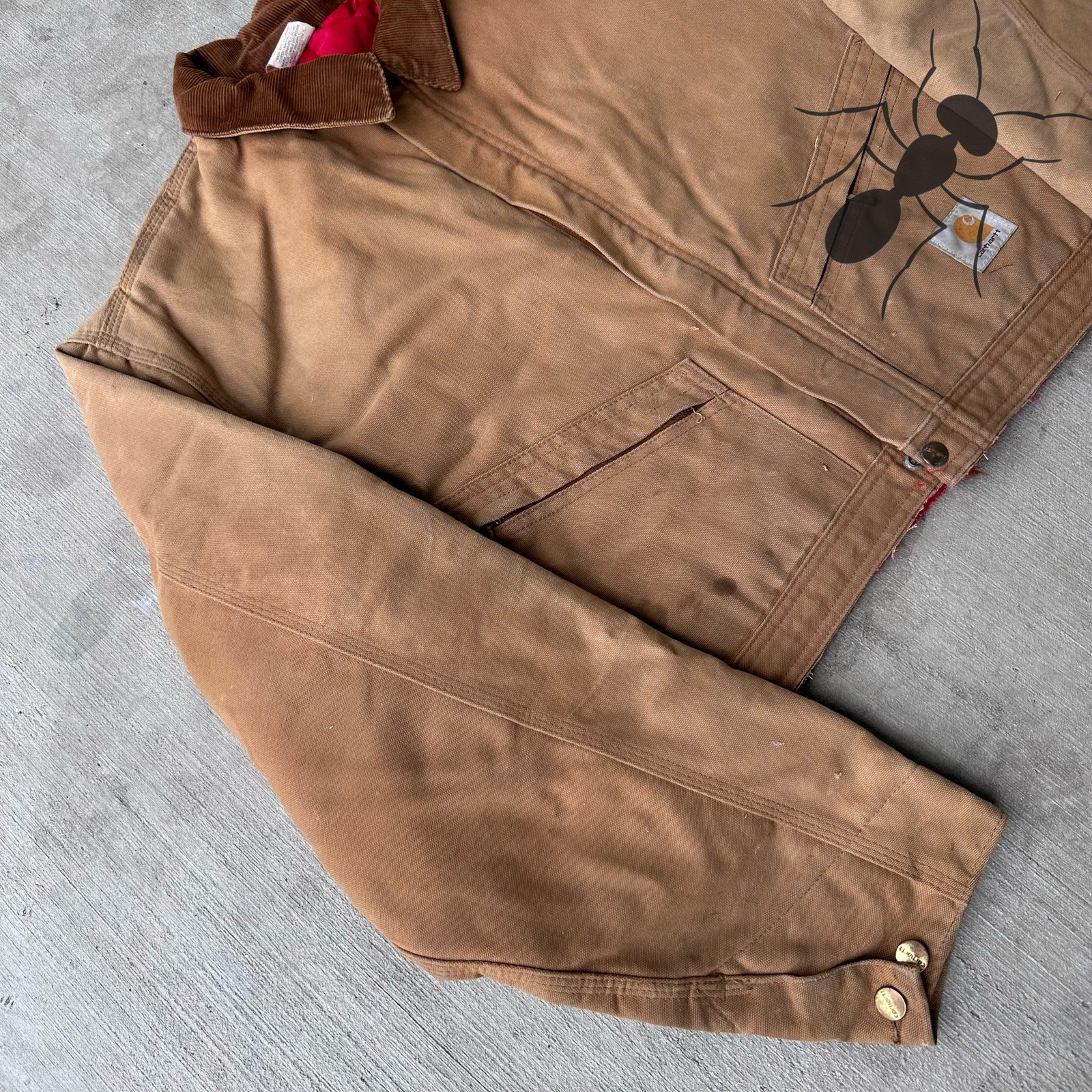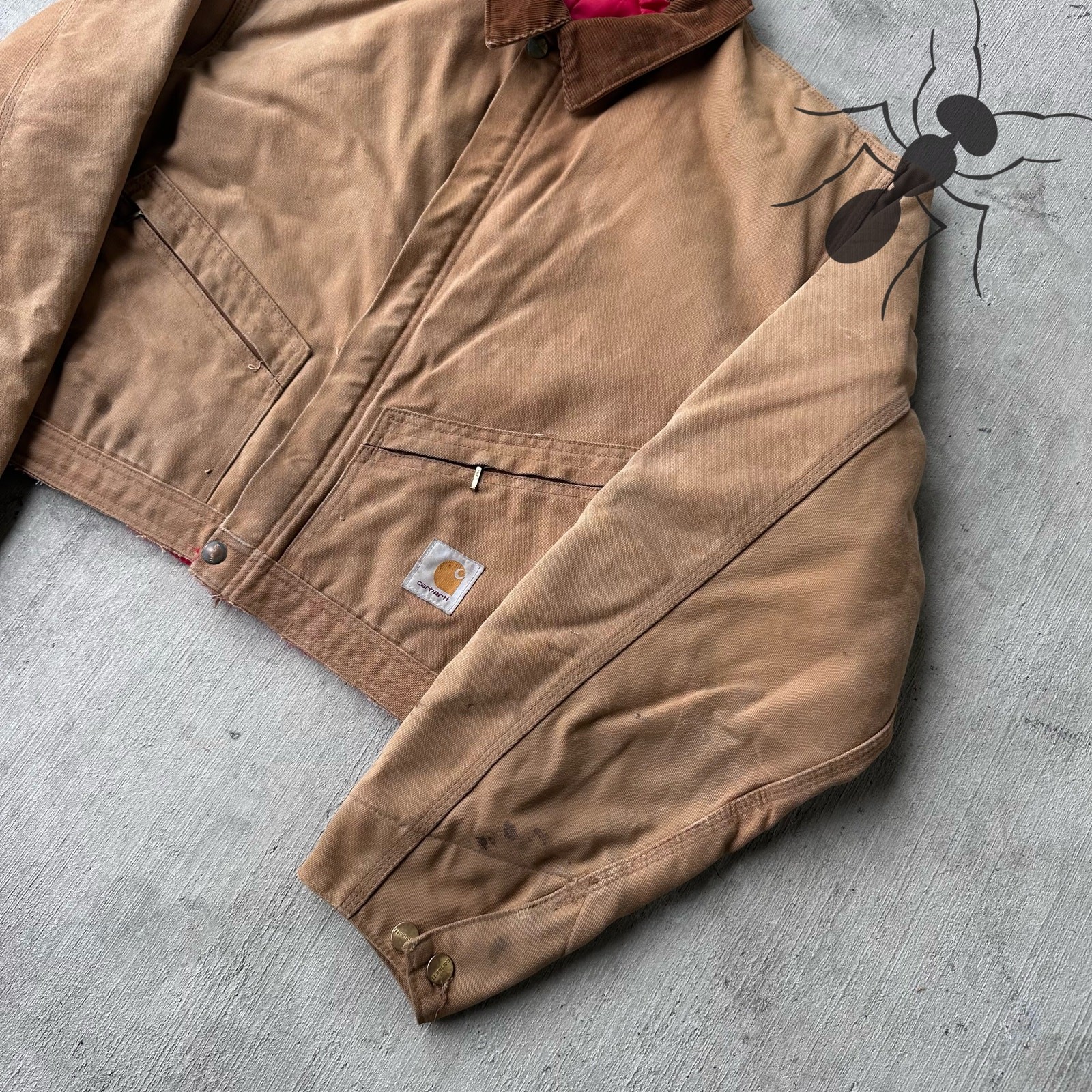Vintage Y2K Carhartt brown cropped Detroit style work wear jacket. Good fade. Stains on sleeves. CUT FROM COVERALLS SO THE ZIPPER DOES NOT WORK!!! Measures 25.5x22. Please check measurements before purchasing. I do my best to show any flaws in pictures. Quick shipping! Bundles encouraged! @ants_haul on Instagram. J0122!!!