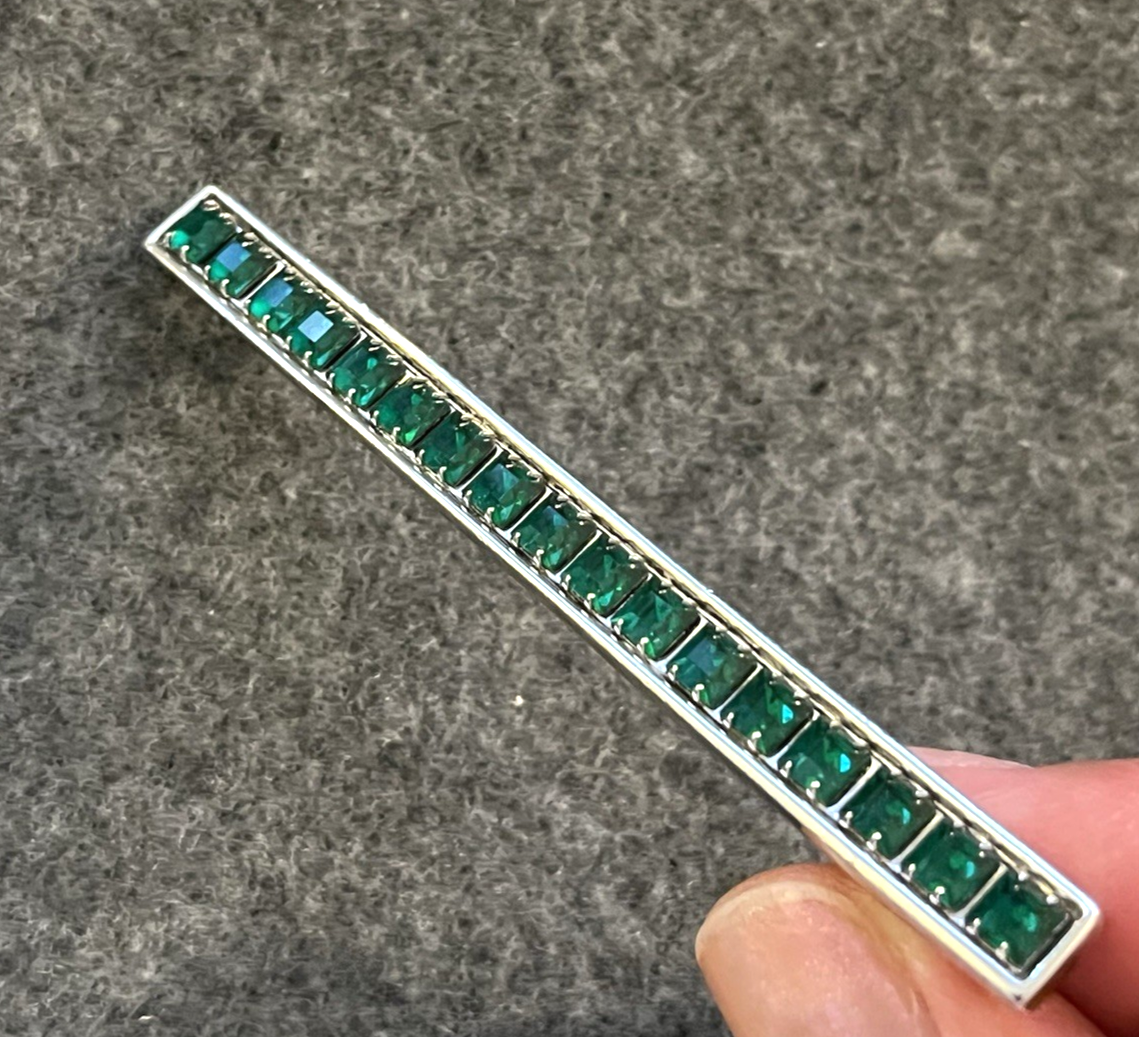 Guaranteed 100% authentic Yves Saint Laurent (YSL) rhodium plated silver tone bar pin / brooch! The pin has prong set forest green color rhinestones. It measures 3-1/8 inches long and 1/4 inch wide. The pin weighs 12.2 grams. Marking on the back side is "YSL", the stamping is partial but you can see it is there. A dime is placed for size reference and not included. Condition is excellent as shown! Please check out all pictures I have taken personally of the actual item. This is one of a kind, hard to find vintage YSL pin. Don't miss out! I do not accept return on this item due to delicate jewelry item. I describe my item exactly what it is. I personally took the pictures and measurements myself. * * * Non-smoking environment! * * *
