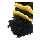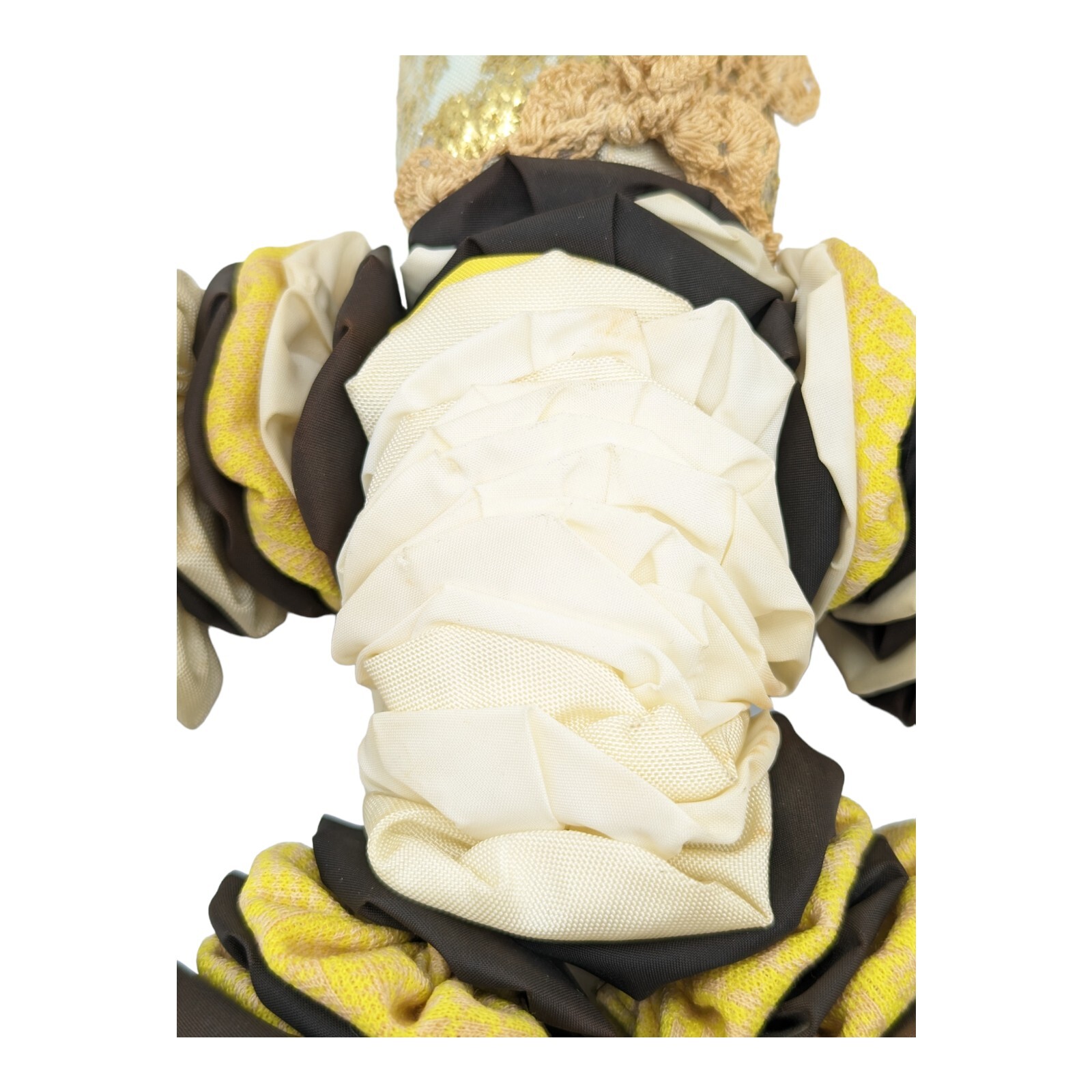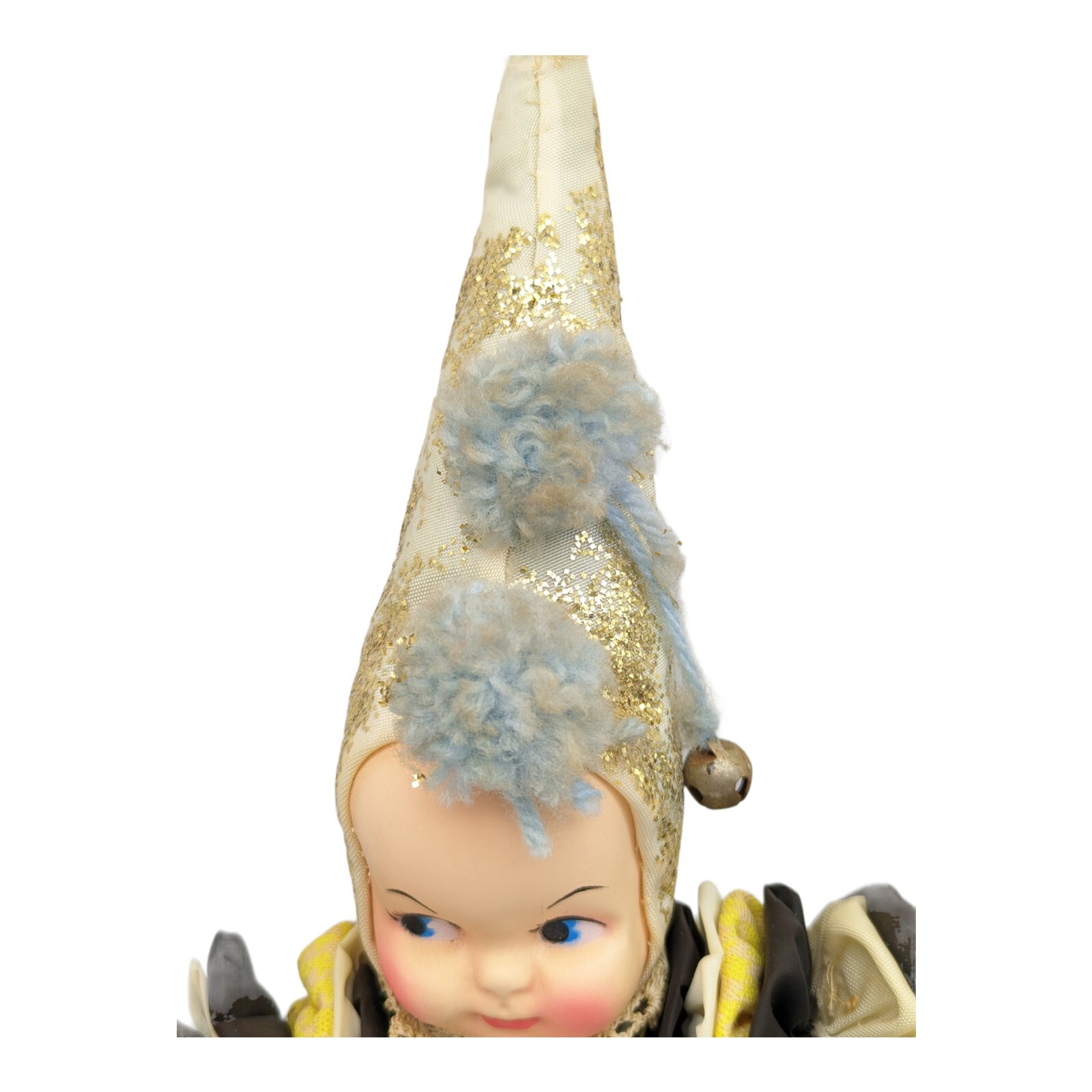 Vintage Yo-Yo Clown Quilt Fabric Rag Doll Cute Baby Face This adorable cutie is in decent shape for its age. The doll features blue yarn pom poms on the hat that's covered in glitter , black yarn pom pom feet and hands 2 bells and yellow/ brown fabric with one blue fabric piece. The glitter is patchy in some areas and is shedding but spray glue could keep it intact. The blue pom poms need cleaning. See all pictures to see the condition in detail . Measures approximately 15 in long.
