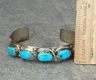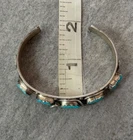 This is an amazing Vintage Zuni Rattlesnake sterling silver bracelet, ring and earrings set. This set features natural Hand cut High grade 11 sleeping beauty turquoise gem stones. There is no purity mark ,however it has been tested positive for sterling silver. Signed by renowned Zuni artist Effie Calavaza (1927-2019). The inside measurement of the bracelet from tip to tip is approximately 5-3/8" and the opening measurement between the tip is approximately 1-1/4" Approximate width of the bracelet is 2-1/2"(across inside). Approximate height of the bracelet center/face is 1/2"(measured from center of the bracelet). Sturdy 35.2 grams in my scale. Ring size is 6.5 (6-1/2) in my ring sizer. Approximate height of the ring is 7/8" Approximate size of the earrings are 1-1/4"L, 1/2"W Approximate total weight of the set is 53g in my scale. This bracelet would be a great addition to any Native American or Southwestern jewelry collection. Also this amazing jewelry set is a timeless beauty with lots of good energy! SMOKE AND PET FREE ENVIRONMENT. If you have any question please contact me via eBay messages and PLEASE CHECK MY OTHER LISTINGS AS WELL! THANK YOU FOR STOPPING BY!