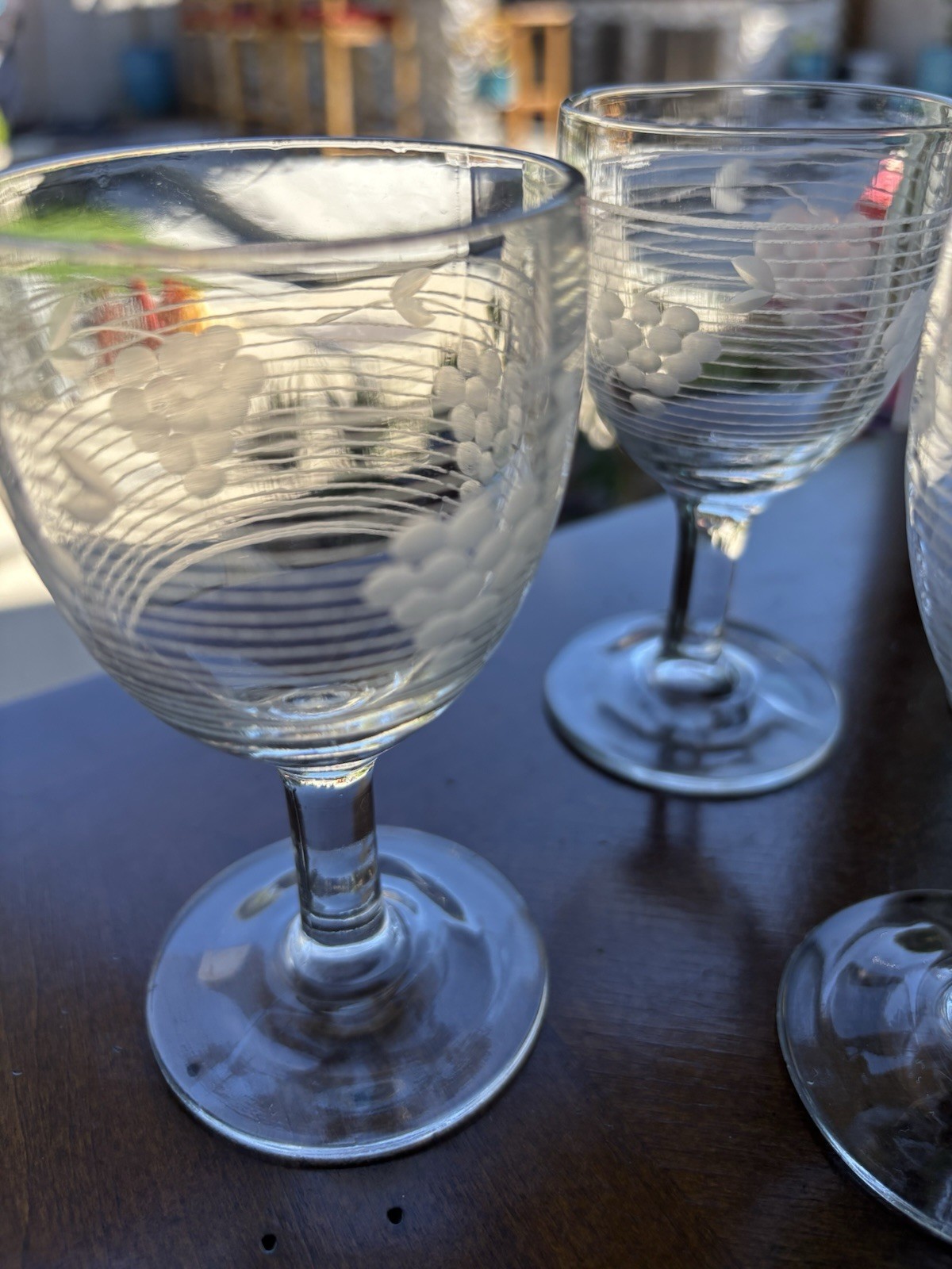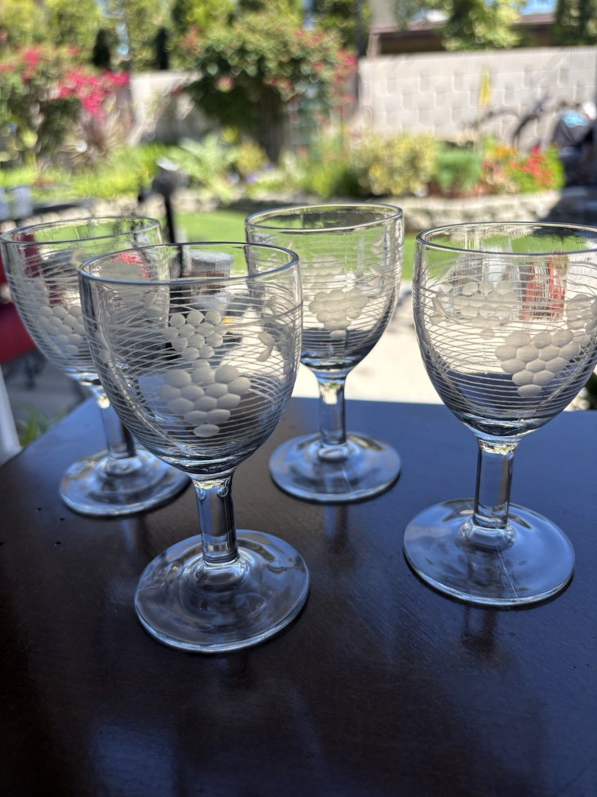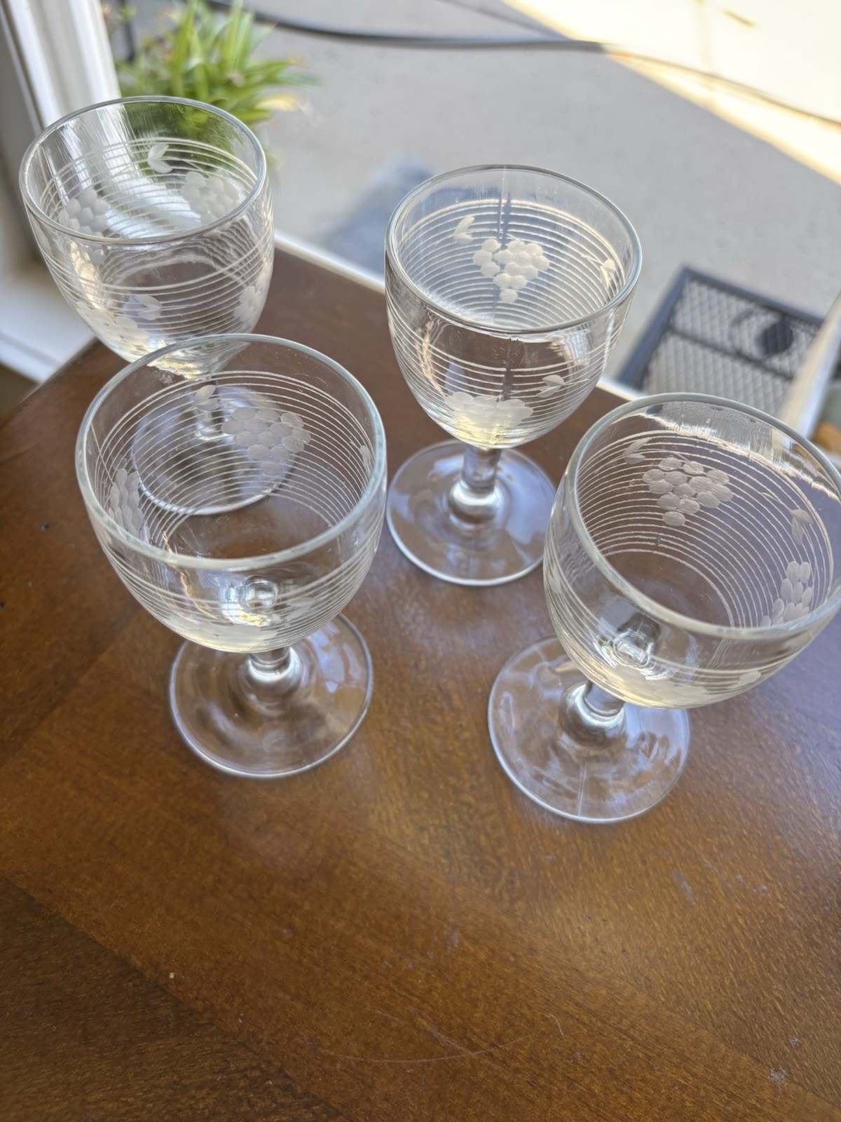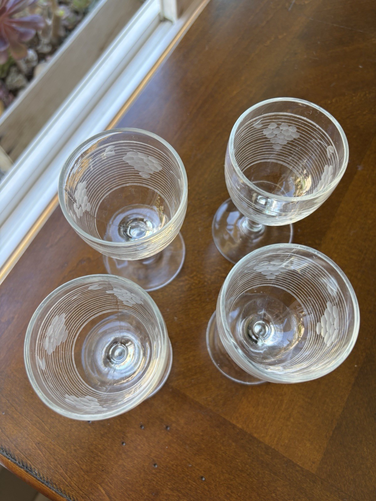 These vintage depression Era cordial glasses feature a charming "Grape on Grid" etched pattern, adding a touch of elegance to any drinkware collection. The clear glass with a glossy finish and etched design give them a sophisticated look, perfect for all occasions including casual gatherings. Manufactured in the 1920s, these cordial glasses are a classic piece of barware that can bring a touch of old-world charm to your home. Ideal for those who appreciate vintage decor and unique, timeless pieces. Set of four