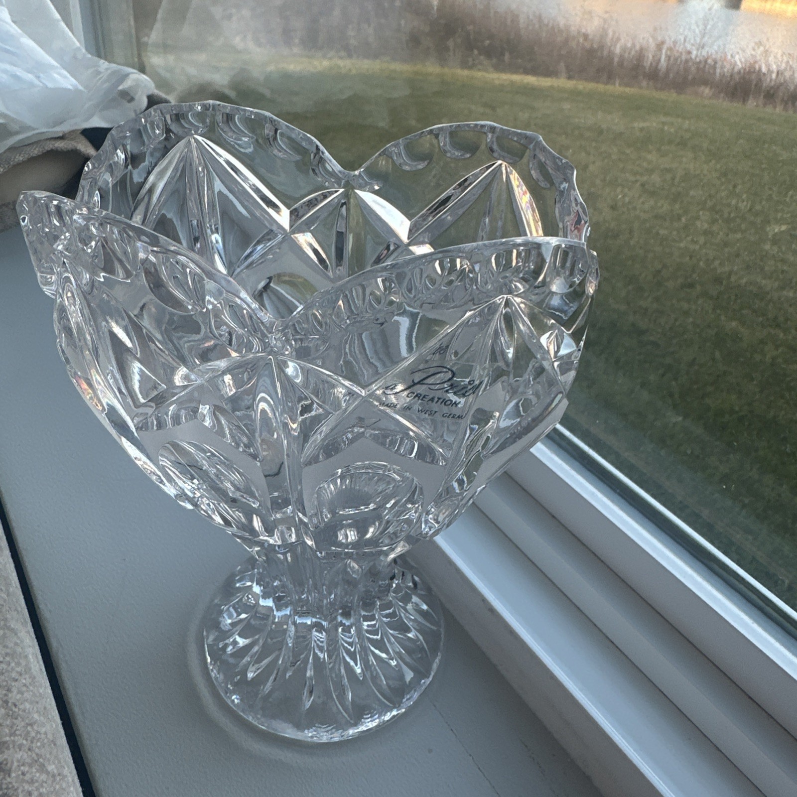 This vintage Y2K hand-cut lead crystal heart vase from West Germany is a beautiful Echt Bleikristall piece by the brand Crystal. The vase features a delicate heart pattern in clear crystal, with a glossy finish. A perfect addition to any collection, this original piece comes in its original packaging and exudes vintage charm. The intricate design and craftsmanship make it a stunning display piece for any home.