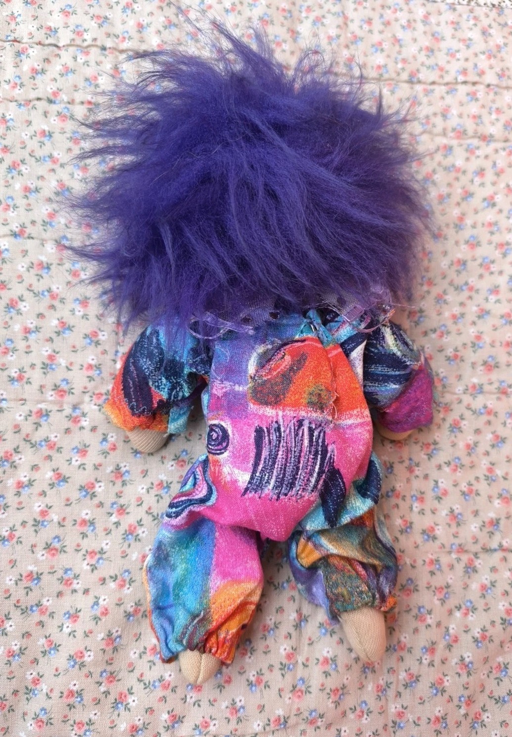 This small vintage handmade Waldorf textile doll is perfect for all occasions. The clown character is dressed in purple straight hair and grey eyes. The doll is made of cloth and fabric, and comes with socks/tights included. This artist doll is unisex and suitable for baby and toddler age groups. It is 6 inches in size and has a firm head. This doll is perfect for those who love retro themes and enjoy handmade items. It is not signed and is not antique.