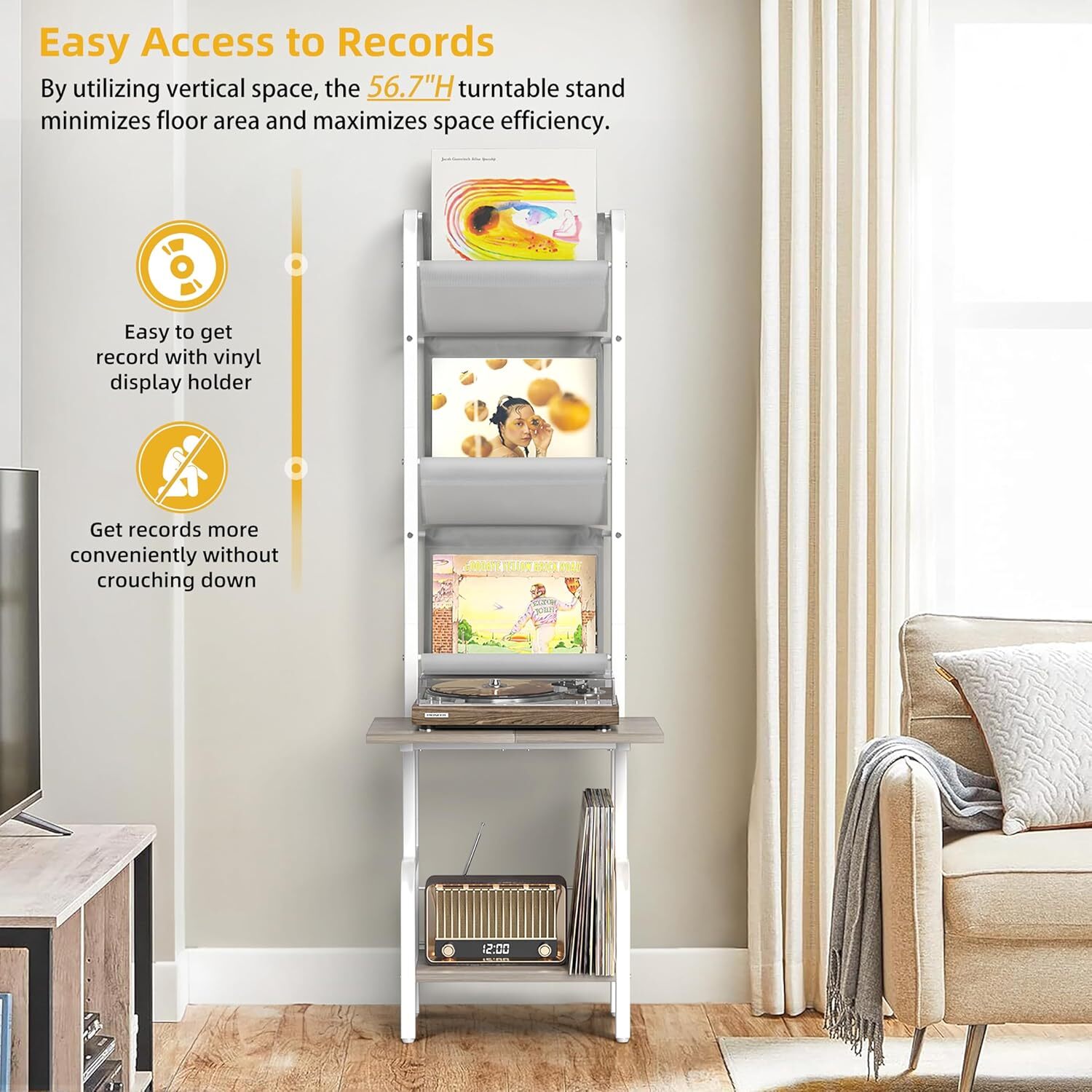 【Extra Large Countertop】Specially enlarged the countertop for the record player, the record player stand with vinyl storage can hold almost any size of record players. You can jam out to Harry Styles full blast without worry of your turntable sliding off. 【Vertical Design, No Need Crouch】Overall Dimension: 13.8" L x 11.8"W x 56.7" H. Using the vertical space not only effectively reduces the floor area, but also makes it much more convenient for you to get the record without crouching down. 【Large-Capacity Turntable Stand】The record player table features 3-layer vinyl display rack and 2 large record shelves, providing ample storage space for your record players, records, speakers, audio equipment, books, magazines and more. The record holder can hold up to 200 records. 【Easy to Find Out Records】3-layer vinyl record storage holder keep everything organized so you can separate your stack by genre or however you want. The record display organization makes it easier to find out records as well as decorates the record table with the stunning record covers. 【Sturdy and Durable】Made of thickened metal frame, high quality easy cleaning wooden board and high-grade oxford fabric, the record player cabinet for bedroom and living room ensures a longer service life without any wobbling or shaking. Load capacity for overall item is 300lbs. On Jan 2, 2025 at 03:10:40 PST, seller added the following information: