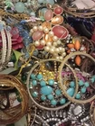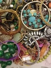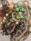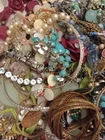 This vintage jewelry lot consists of a mixed assortment of pieces, including single earrings, bracelets, chains, bangles, and various other items. The lot weighs approximately 8 lbs and is ideal for craft projects, repurposing, or repairs. The pieces are made from mixed metals and materials, including rhinestones, and are in various colors. This lot offers a treasure trove of vintage and modern jewelry items that can be used creatively for crafts, art projects or jewelry repairs. 151/157/3