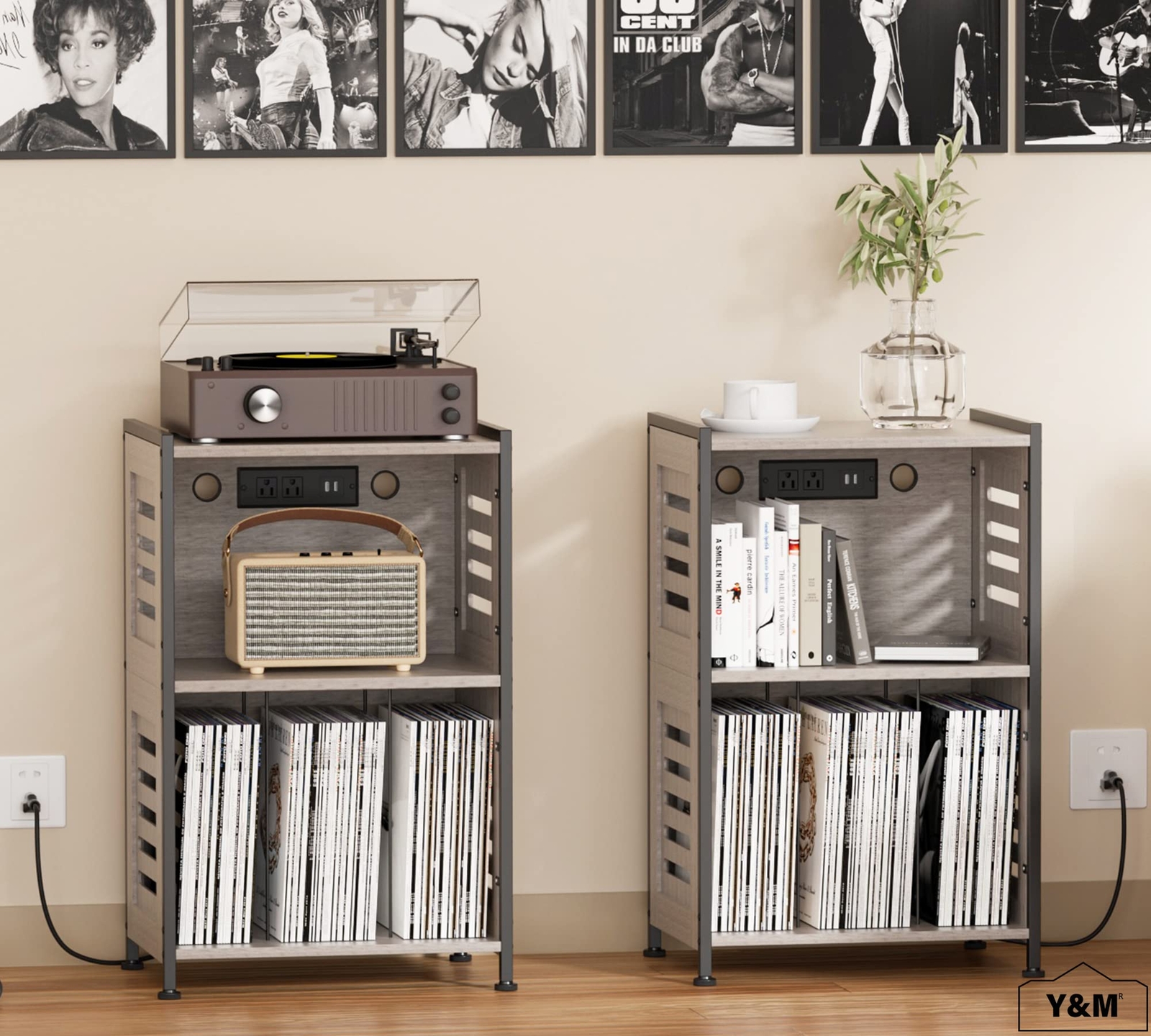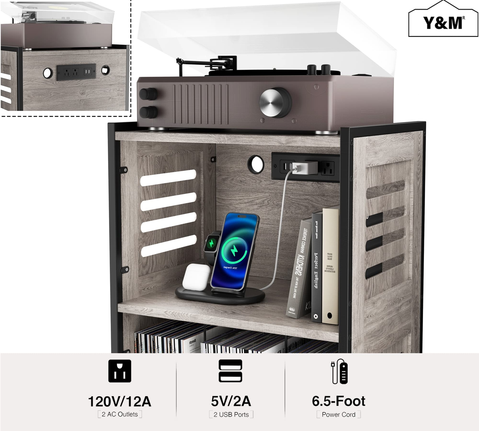 šµćPower Outlets & USB Charging PortsćRecord player stand is designed with a socket of 2 USB ports and 2 standard plug sockets on the back of the second-floor space for your record player, turntable, receiver, speaker, phone, headset, and tablet with fast charging flexibly at the same time, which provides great convenience to your life when you are using them. šµćEnough Storage SpacećThe spacious top and 3 rectangular storage can accommodate at least 70 record albums to help you reduce clutter. The middle space can freely choose to place stereos, speakers, or other small objects. The cabinet top supports up to 20 lbs. The large open compartment can hold up to 15 lbs while each small cubby can bear up to 5 lbs. Overall Dimension: 16.5"(L) x 13.5"(W) x 28.3"(H). šµ ćExcellent CraftsmanshipćMade of thick particle board and solid metal legs reinforced, the record player stand features long-lasting durability and is not easy to deform. Blinds on either side of the table add vintage style. It comes in modern grey color, combining rustic elements with its modern silhouette. šµćMulti-Occasions Useć Modern simple and generous-style record player stand, suitable for various occasions, including living room, study, bedroom, office, etc, Also can serve as a bookcase, vinyl record storage cabinet, bedside table, file cabinet, etc. šµćEasy to Assemble and ReliablećThis vinyl record stand comes with detailed instructions for quick and easy installation. It is very easy and fast to put together with step-by-step instructions. If you have any questions about assembly or stand, please contact us for support and solution.