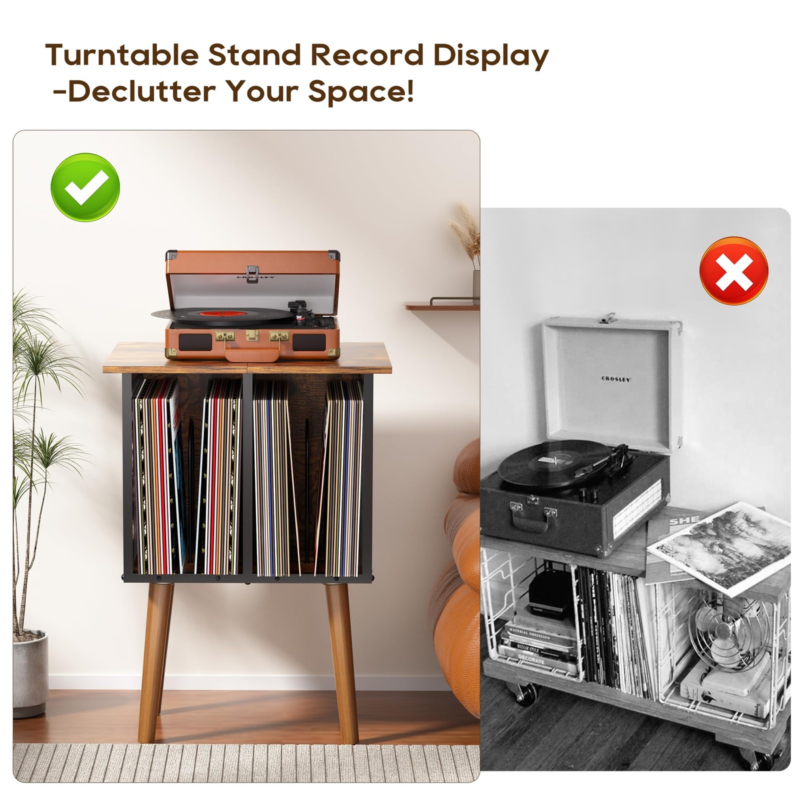 Record Player Stand with Vinyl Storage – Mid-Century Modern Cabinet for 80 Albums (Brown) Elevate your vinyl collection with this stylish and functional record stand that combines retro charm with practical storage. Crafted from solid wood with sleek black metal dividers, this record player stand blends durability with mid-century modern elegance. The rich brown finish and metal accents create a timeless look that complements any decor. Perfect for vinyl enthusiasts who appreciate both style and substance. Unique Features for Enhanced Functionality ✔ Spacious Wooden Tabletop – Features a natural wood grain pattern that adds warmth and vintage character while providing ample space for your turntable. ✔ High-Capacity Storage – Holds up to 80 vinyl records, plus media accessories like speakers, headphones, or remotes. ✔ Removable N-Shaped Dividers – Customize compartments to store records, books, magazines, or other essentials. ✔ Sturdy & Stable Design – Reinforced angled legs support up to 70 lbs, ensuring long-lasting durability. ✔ Easy-Clean Surface – Simply wipe with a damp cloth to maintain its sleek appearance. Ideal for: Living rooms (next to your sofa or entertainment center) Bedrooms (as a stylish nightstand) Home offices or studios (for organized media storage) Small apartments (maximizes space without clutter) More than just a record stand, it also works as a: Nightstand or bedside table Side table or console table Bookshelf or file organizer Display shelf for decor Premium Materials: Record player stand with vinyl storage combines a solid wood construction with sleek metal dividers. The mid-century-inspired black metal accents complement the retro brown finish, enhancing its aesthetic appeal. If you love mid-century modern design, this vinyl record stand is the perfect choice for you Unique Features: Vintage Spacious Wood Tabletop – Features an elegant natural wood grain pattern, creating a warm, retro-inspired atmosphere while serving as a large-capacity turntable stand. Multi-Functional Storage – Designed to hold your vinyl records and media essentials while accommodating your record player. The smooth surface is easy to clean with just a damp cloth. Removable N-Shaped Dividers – Customize the storage space to fit larger items like books or magazines. Reinforced Angled Legs – Supports up to 70 lbs for added stability Portable and Space-Saving: With compact dimensions (18.9" L x 14.57" W x 27.5" H), this vinyl record table fits snugly in small spaces like corners, bedrooms, living rooms, music classrooms, or offices—making it a versatile addition to any room Versatile Functionality: Doubles as a furniture, nightstand, bedside table, side table, bookshelf, or file cabinet. Its modern-retro fusion design blends seamlessly with mid-century, vintage, minimalist, or eclectic home decor, making it a perfect fit for any interior style Easy Assembly: Includes step-by-step instructions and tools for effortless setup