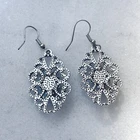 A delicate metal filigree open design drop earring centered with a small violet bead. Earring length is 1 1/14" and 3/4" wide, weighing 0.1oz each with fish-hook backs. Lightly cleaned, pre-owned and in beautiful condition.