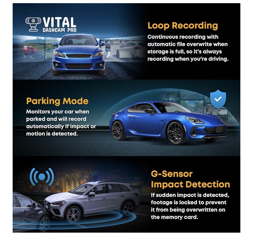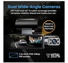 The Vital Dashcam Pro 2025 is a dual car camera system featuring a front and rear camera with a resolution of 1080p. It includes special features such as built-in display, G-sensor, loop recording, night vision, and parking assistance. The dash cam is designed with a 170-degree field of view and a dashboard mount for easy installation. It is compatible with various vehicle types including cars, buses, minivans, RVs, and trucks. Additionally, the system comes with a charging cable and quick guide for convenience.