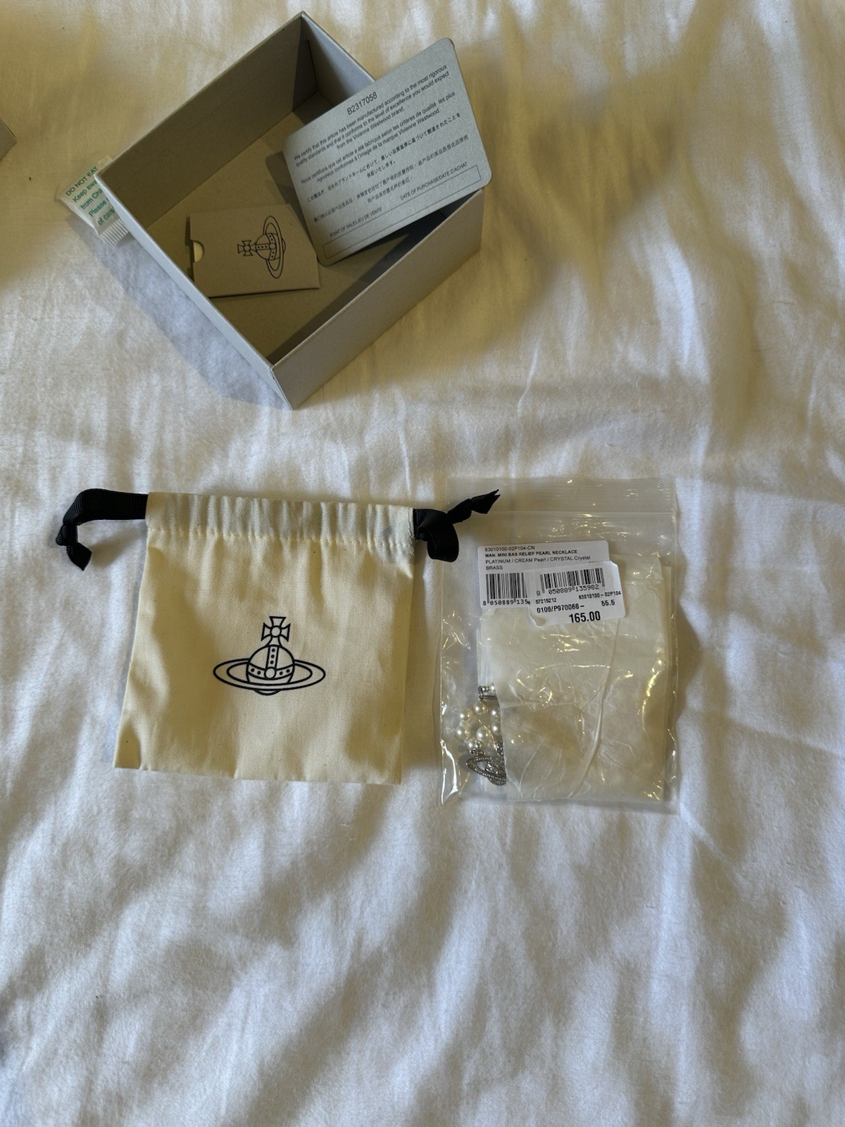 This Vivienne Westwood Silver Pearl Choker Necklace features an oval pendant with six round pearls, creating an elegant and stylish accessory. The necklace is crafted from silver with a ball/bead chain type, and has a length of 42cm. The design is perfect for adding a touch of luxury to any outfit, and is a timeless piece that can be worn for various occasions. Made in Japan, this necklace comes with a box, making it a perfect gift for someone who appreciates high-end fashion.