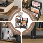 Elevate your vinyl listening experience with this versatile record player stand and storage combo. The sturdy metal frame with a rustic wood finish creates an industrial-chic aesthetic that complements any living space. Designed to hold up to 200 albums, this stand offers ample storage for your cherished record collection. The top shelf provides a convenient platform for your turntable setup, while the lower shelves allow easy access to your vinyl records. This multifunctional piece also serves as an end table, seamlessly integrating into your living room decor. Crafted with attention to detail, this record stand is a must-have for music enthusiasts seeking both style and functionality. Durable & Sturdy: Built with thick MDF wood panels, reinforced metal frame, and waterproof, scratch-resistant finish for maximum durability, high load capacity and long-term stability 3-Tier Vinyl Storage Rack: Holds 200+ vinyl records, spacious shelves for record players, stereo system, Bluetooth speakers, amplifiers, headphones, plus extra space for **media essentials, books, collectibles. Side Vinyl Display Shelf: Features 3-pocket display rack using soft Oxford cloth, which is not easy to deform and ensures durability and stability for long-term use for showcasing vinyl covers, magazines, and books, ideal for easy browsing, and organized vinyl storage Versatile Storage Cabinet: Functions as a vinyl record stand, media console, bookshelf, side table, magazine organizer, blending seamlessly with living room, home office, music room decor Quick Assembly & Modern Retro Style: Includes easy-to-follow step-by-step instructions, designed with a rustic wood grain finish and industrial black metal frame for a vintage-modern aesthetic