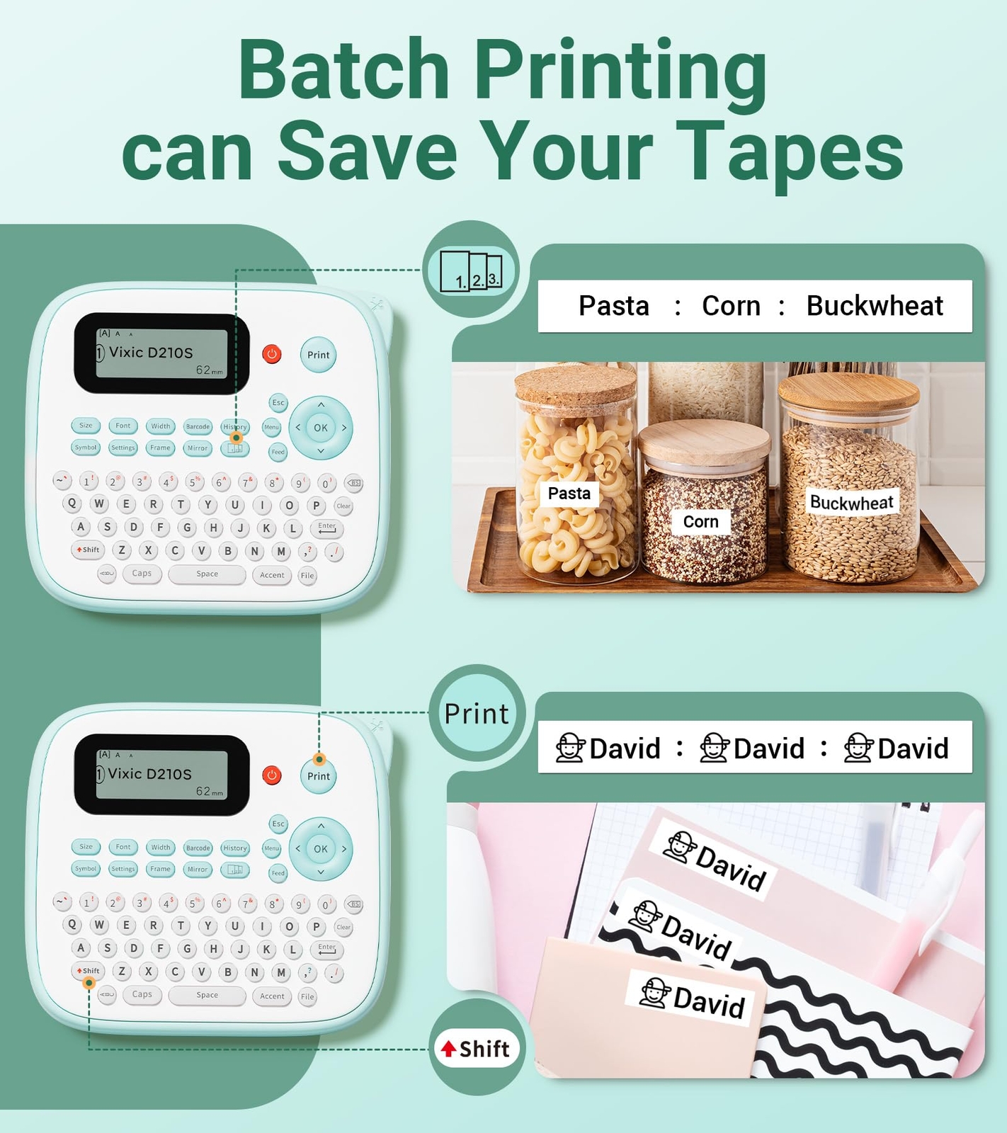 Vixic Label Maker, D210S Label Maker Machine with 4 Laminated Tapes, 12mm Labeler Labelmaker with QWERTY Keyboard, Print Different Fonts Frame Barcode for Home Office School, Green If home, school, classroom, personal items, small business, kitchen, office organization is important to you, Vixic D210S label maker machine with tape is an exceptional choice. The Vixic D210S portable label maker with keyboard is compact and lightweight and was designed to make printing labels simple, it doesn't require any app. Vixic D210S label maker includes USB-C cable that can be powered on immediately for use, but compatible with brother p touch label maker or p touch label printer does not have. Several features built into D210S lable maker that help users create labels customized by selecting 16 fonts, 100+ frames, and more than 800 symbols. The D210S label maker waterproof labels are used widely in food date marking, cosmetics items, food jars, file folders, shelves, books, cabinets, storage boxes, school name tag, school supplies, teacher supplies and more. Back-to-School Essentials: D210S label maker for kids school items, classroom teacher, classroom must haves. Featuring cable labeling help you easily organize your wires and cables. This label maker machine can produce flag type labels and wrap type labels for wires. D210S labeler is featuring multiple editing, that can type and print up 20 different labels each time. It prints up to 4 lines of text on labels up to 12mm or 0.47 1/2 inch wide. The D210S label makers also have memory feature that allows you to save up to 9 labels for quick reprinting tasks. D210S label machine is compatible 3 different widths laminated label tape: 6mm 1/4", 9mm 3/8", and 12mm 1/2". D210S label maker tape is durable and easy to peel. 12mm 0.47 Inch black on white tape is popular. No sticky residue remains when the labels are removed. Water resistant, temperature resistant, abrasion resistant, chemical resistant and fading resistant, good for indoor or outdoor use. Specialty non-laminated iron-on fabric tape are available for clothes, school uniforms, and linens - all with various colors, sizes, and types. MORE BENEFITS Vixic D210S Label Maker Machine with Tapes, Easy to Use for All Ages: No need for mobile device connections! The D210S label maker simplifies the process for everyone, including kids and the elderly. From powering on to editing and printing, it only takes 20 seconds! Experience quick and effortless labeling Power-Ready Label Maker Machine: Instantly usable with the included USB-C cable. Direct power supply extends the labeler's lifespan by an additional 5 years than rechargeable label makers. In addition, you can opt for the optional 6 AAA batteries (not included) to stay powered for portable usage Enhanced Visibility: The D210S lable maker is equipped with a German-imported screen, where the screen clarity is increased by 25%, ensuring easy readability. The improved screen quality allows for typing letters without any concerns Chain Print Reduces Label Waste: The D210S label maker with a soft QWERTY keyboard features multiple editing functions and narrow settings, allowing you to easily edit up to 20 different labels. With each 26.2 feet length tape, the D210S labeler enables you to efficiently print 264 labels (1.2 inch per label) and save up to 11 feet of blank labels Add your Personal Touch: The D210S label machine offers multiple alternatives for pre-designed 800+ symbols, 100+ frames, and 16 different fonts. It even offers the ability to print barcodes, up to 4 lines of text, and allowing you to adjust font sizes (large, medium, small) to cater to all your labeling needs Label Maker Waterproof Labels: Package includes 4 packs full-length (26.2 ft each) black on white tapes for added value. Vixic label maker tapes 12mm 0.47 inch use 7-layer lamination technology to withstand water, fading, abrasion, and temperature. D210S laminated BZ tapes can be stored for up to 10 years. Great for home, classroom, small business, and office organization. Easily stick labels on kids' school items, file folders, kitchen containers, jars, storage bins, school supplies, etc