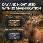 Photo Resolution: 1M(1280x960)by interpolation、VGA(640x480) Video Resolution: 960P(1280x960@30FPS )by interpolation、VGA(640x480@30FPS ) Lens: F1.2 larger aperture, f=25mm,Auto IR filter Lens Angle: FOV=10°,caliber is 24mm Display Screen: Inner screen is 2.31”960*240 TFT LCD, Outer screen is 98x48mm,with 5X large window magnifier Storage Media: Micro SD card, up to 32GB USB Port: Micro USB 2.0 MIC: NO Speaker: NO Auto off: 3 min/ 5 min/ 10 min/OFF IR LED: 3W,850nm strong infrared spotlight ,7 grades infrared adjustment View Distance In Complete Darkness: About 984ft/200-300 meters View Distance In Low Light: 118 inch/3 meters~infinity Digital Zoom: Digital Zoom 4X Power Source: 9V;6*AA alkaline, not include OSD Language: Multiple languages are optional Date Stamps : Support to set date and time. Date and time stamp on photo and video files. Operation Buttons: 6 buttons Operation Temperature: '-4F to +140F Storage Temperature: '-22F to +150F Dimensions & Weight: approx. 8*5.4*2.2inch /1.3lb Package List: Night Vision x1 Carrying bag x1 32G TF card x1 USB Out Line x1 Cleaning Cloth x1 Instruction x1 Strap x1