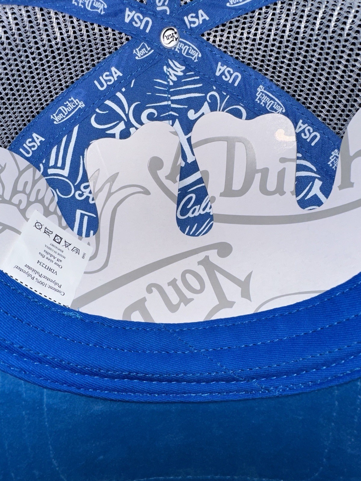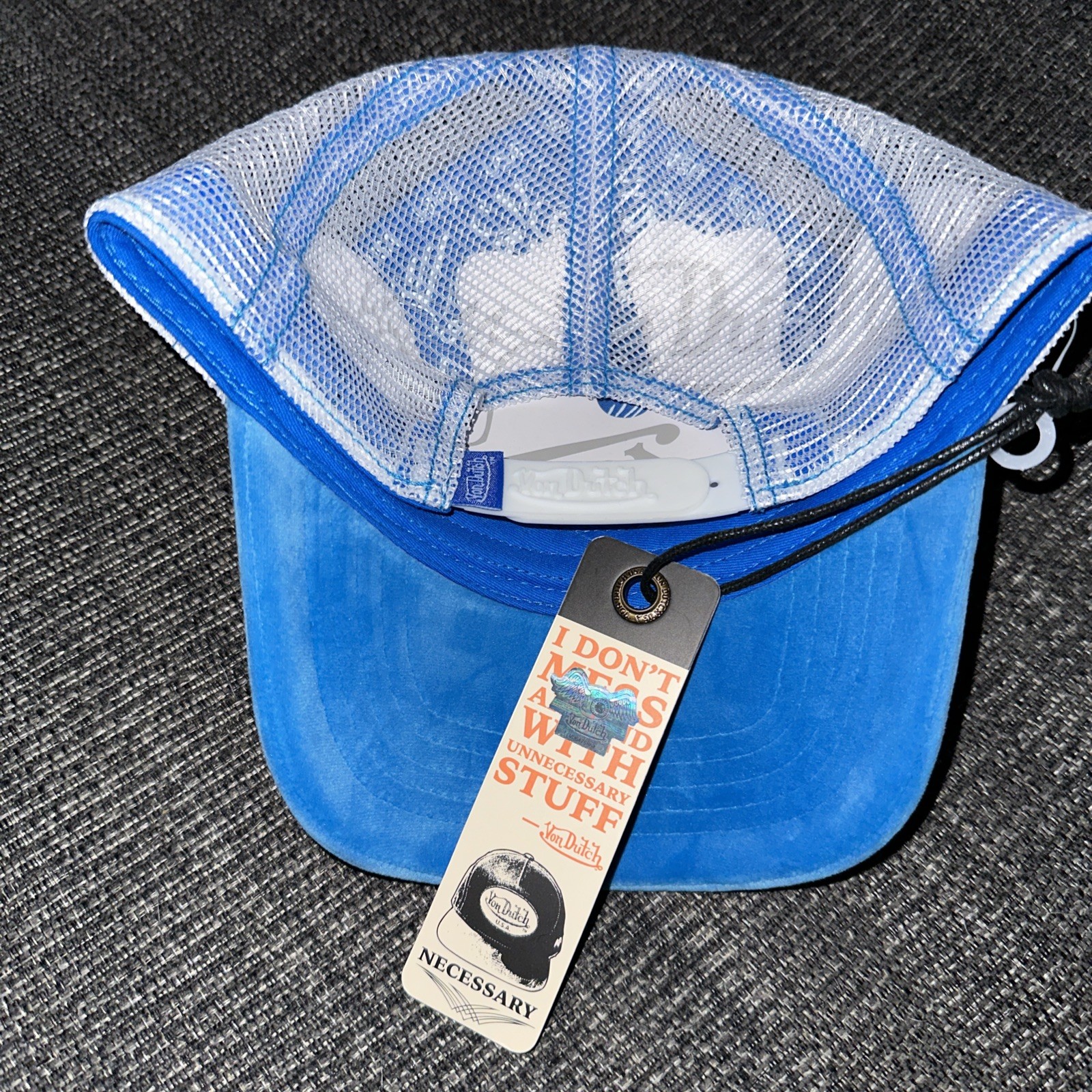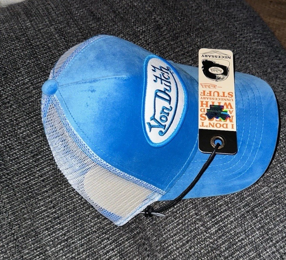 Von Dutch Velvet Trucker Snapback Hat-Blue new with tags The Von Dutch Velvet Trucker Snapback Hat-Blue adds casual cool to your wardrobe. Its breathable mesh back panels and adjustable snapback closure ensure all-day comfort and ventilation during outdoor adventures, road trips and everyday wear. A unique velvet patch elevates your style, while the structured crown keeps the hat looking sharp and fresh. This classic trucker delivers modern flair and pairs effortlessly with any laid-back outfit. Features Brand: Von Dutch. Material: Plush Velvet fabric in rich Blue tone. Color: Vibrant Blue hue complements varied outfits. Style: Classic trucker hat silhouette featuring a breathable mesh back panel. Closure: Fully adjustable snapback strap secures a precise, customized fit. Crown: Structured high-profile crown maintains a clean, crisp shape through daily use.
