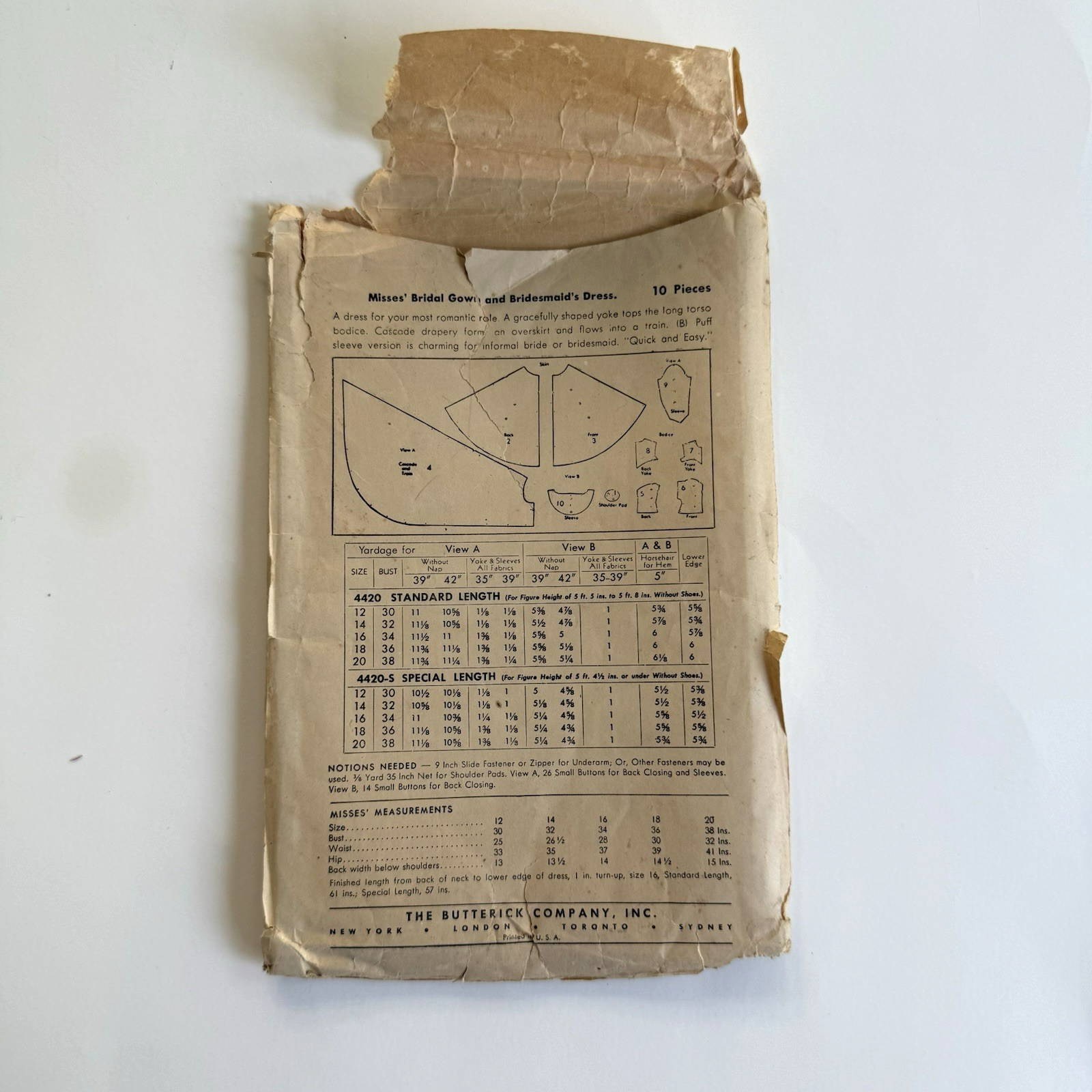 Vtg 1940s Butterick Bridal Gown Pattern 4420 EASY SEWING PATTERN Bust 30" Butterick 4420 Vintage Sewing Pattern Misses' Bridal Gown and Bridesmaid Dress: The envelope contains patterns and instructions to make a misses' wedding gown and a bridesmaid dress. This is a Sewing Pattern not a completed item! Size: 12 Bust: 30" Waist: 25" Hip: 33 Year: 1948 Condition: Cut & complete; unmark pattern; a few light splatter stains on pattern (see pics) Envelope: Poor, age discoloration, torn flap with missing piece, tears on the front & back, bottom split all the way open & some wrinkles (see pics) Storage: My home is pet-free however some patterns were acquired & have unknown history. Shipping: I ship with TRACKING & try to ship next business day. #sewingpattern #vintage #winksstoreroom #weddingdress #antique