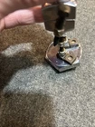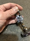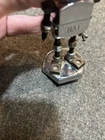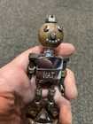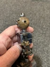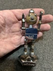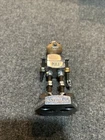 Great looking folk art advertising robot. Missing right hand, some fingers on left and wing nut ears. Little dusty between feet need a lil q-tip action with denatured alcohol. Light surface rust on chrome or nickel plate body transferred from hands at side. I recommend #0000 fine steel wool. I really wanted to dive in and tap a new hand and replace ears, but then I thought I’d be taking that enjoyment away from the new owner. Please send me a pic if you decide to do some work to him or even if you just decide to keep him as is. Next day shipping.