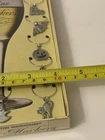 Get ready for your next spooky soirée! Up for sale is a charming set of 6 vintage Halloween-themed wine markers from Boston Warehouse (2001). These are a fantastic way for guests to keep track of their drinks while adding a touch of "mark of distinction" to your glassware. The set includes six unique charms: • Smiling Ghost • "Boo" Text • Spooky Bat • Jack-o'-Lantern Pumpkin • Haunted Mansion • Scaredy Cat ⭐️Condition Report⭐️ New in original box. The box is still factory sealed with the original tape (see photos). The packaging shows minimal shelf wear consistent with its age, but the charms are pristine and have never been used. Dimensions: • Box Height: approx. 8.5" • Box Width: approx. 4.25"
