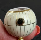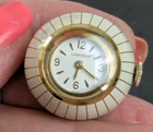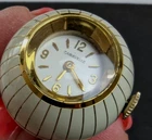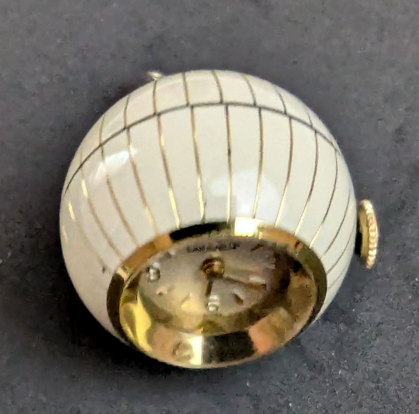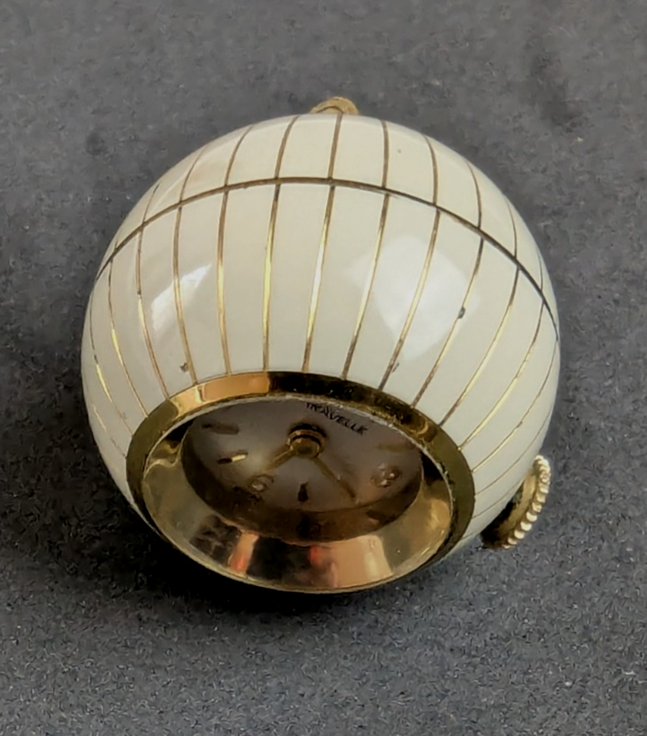 Extra nice Vintage Circa 1960s Gold and White Enamel Caravelle Ladies Pendant Watch. 17 Jewel Swiss Movement by Bulova for Caravelle. Mechanical wind and in working order and very accurate. The orb measures approx. 25mm or 1" in diameter. Great looking to wear as a large Charm or Pendant. 5263