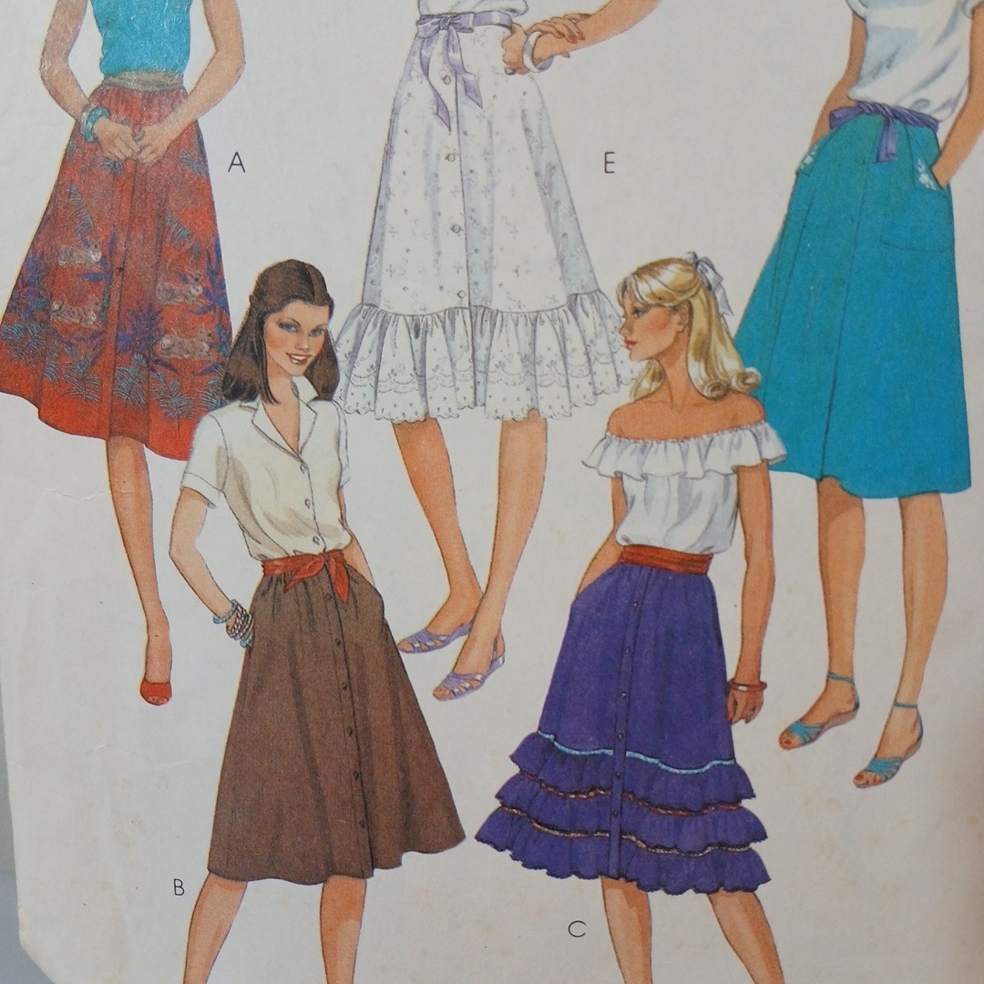 This product is a vintage 80s McCall's pattern #7554 for making skirts in five styles, with a size 10 waist and a 25-inch waist measurement. The pattern is uncut and includes the original instructions. The skirts are designed for everyday wear and are a part of the brand's collection for women. Made in the United States, this adult-sized pattern is a collectible for sewing enthusiasts interested in vintage original patterns from the 1930s to now.
