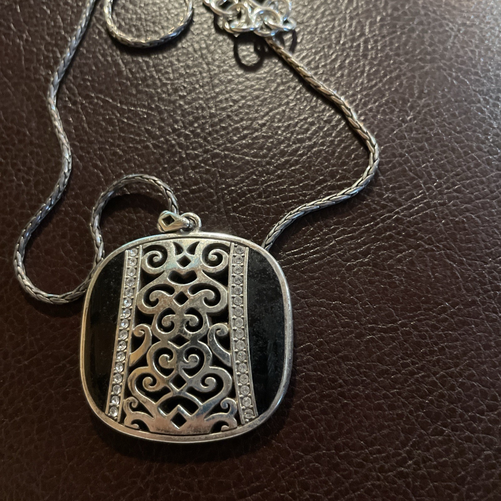 The Vtg BRIGHTON Shadow Play Reversible Black Gold Silver Crystal Pendant Necklace is a stunning piece of jewelry featuring a reversible design in black, gold, and silver tones. The necklace is adorned with 32 white/colorless crystals and is made of silver plated metal with a lobster closure. It has a 21 inch spiga/wheat chain and is perfect for special occasions like engagements, weddings, and birthdays. The pendant style and adjustable features make it a versatile and stylish accessory for any woman looking to add a touch of beauty to her outfit.