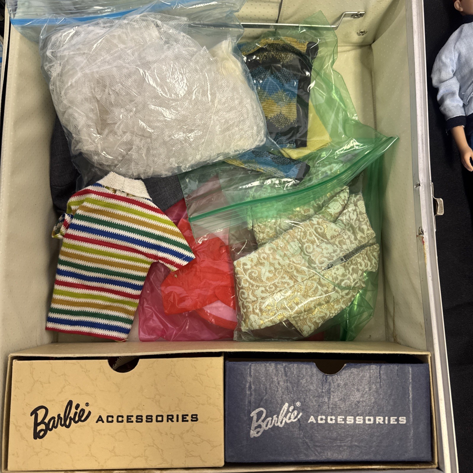 This vintage Barbie bundle from the 1960's includes a collection of dolls, a case, and a wide variety of clothes. The set features classic Mattel Barbie fashion dolls, making it a rare and valuable find for collectors of vintage Barbie memorabilia. The assortment of clothes and accessories included in this lot adds to the charm and nostalgia of this sought-after collection. SKU 006