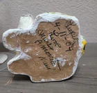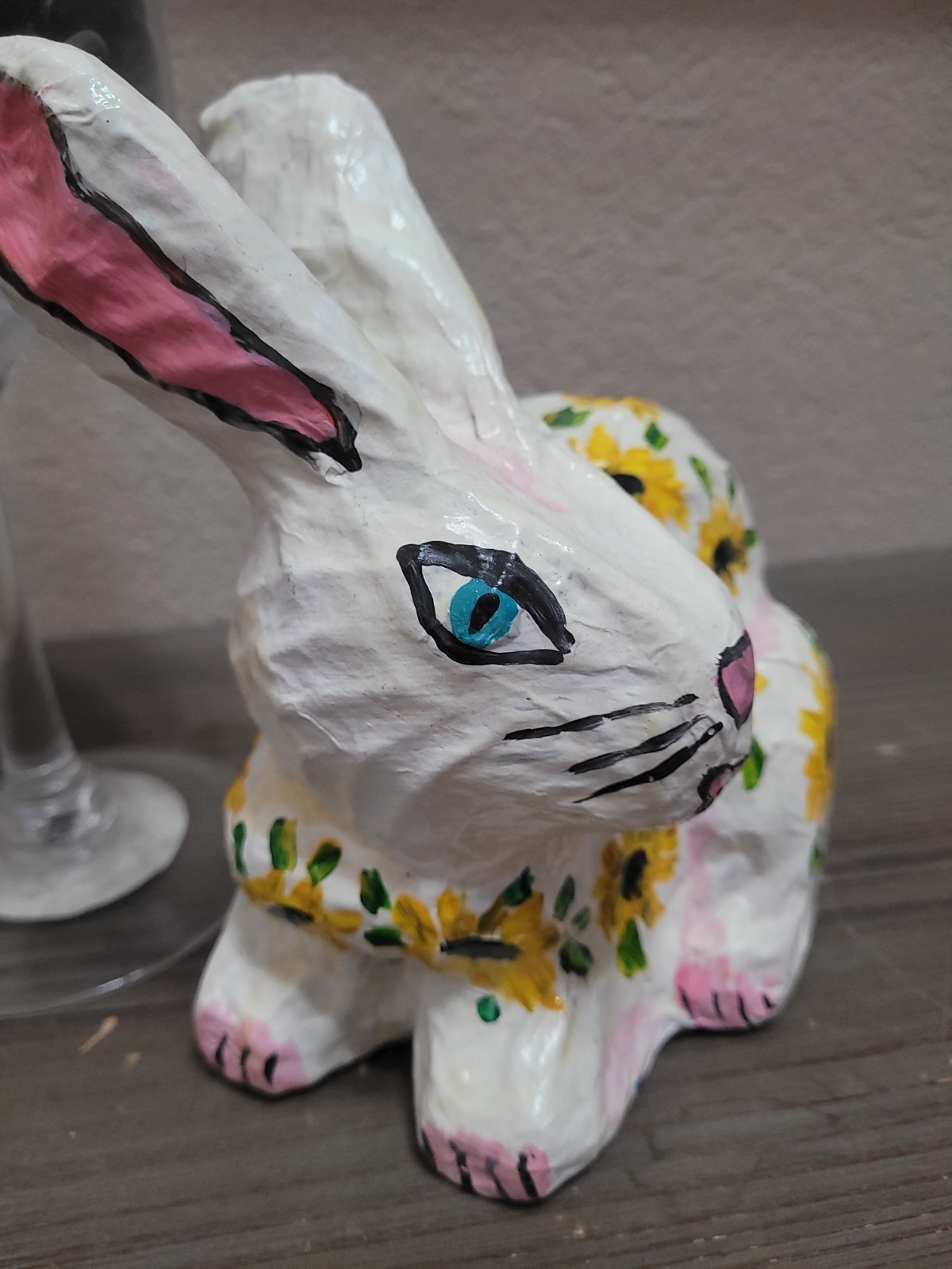 This vintage Easter hand-painted paper mache standing bunny rabbit with sunflower detail is a charming collectible piece perfect for celebrating the holiday season. Made from paper, this decoration adds a touch of whimsy and nostalgia to any space, making it a delightful addition to any collection of holiday memorabilia. With its hand-painted details and unique design, this item is sure to stand out as a special Easter ornament.