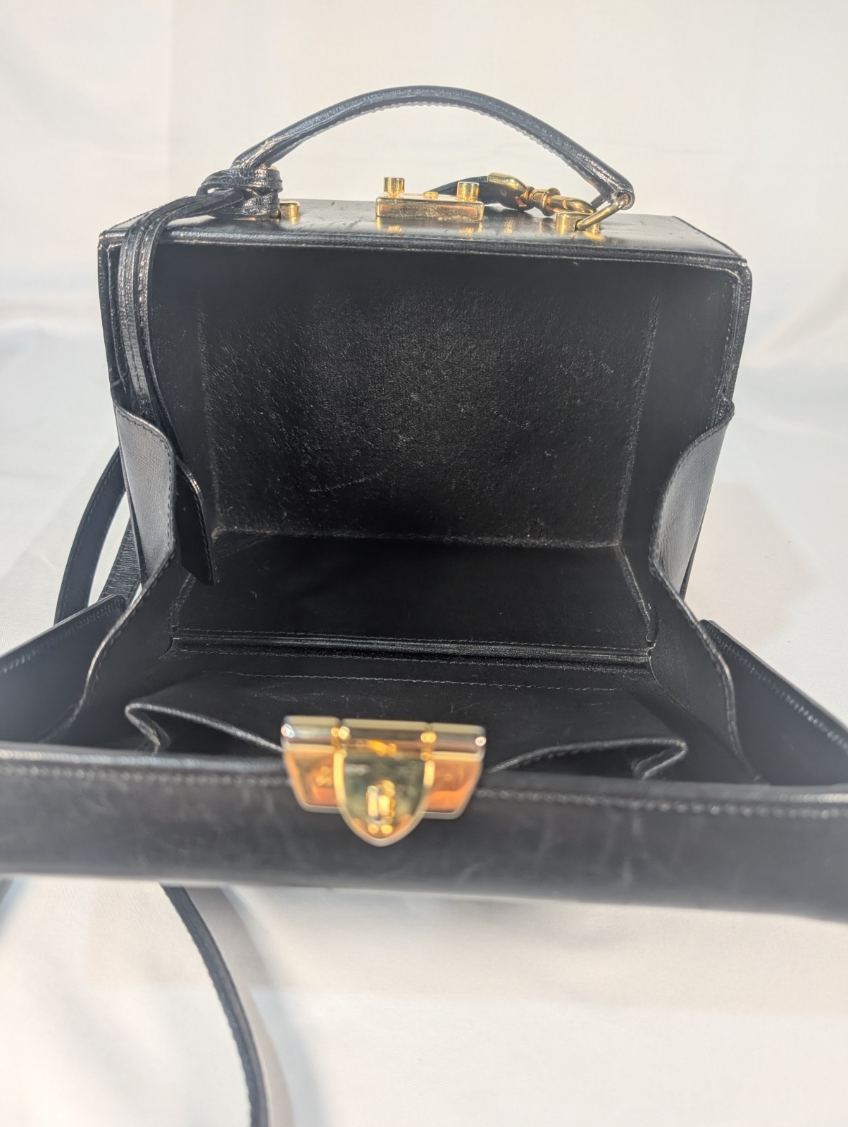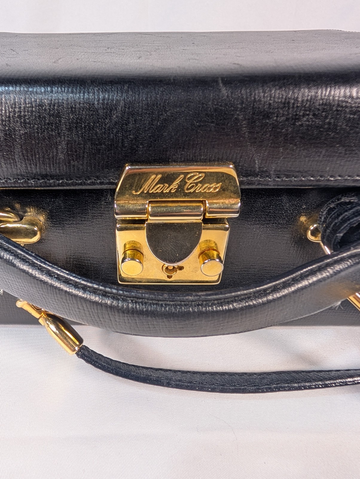 Wonderful Mark Cross Purse. There are significant scratches on the front face of the purse and some loose threading on the top. This purse comes with the key for the lock.