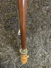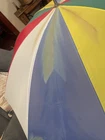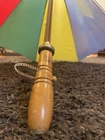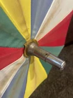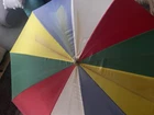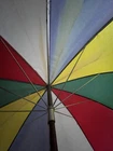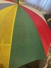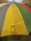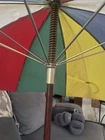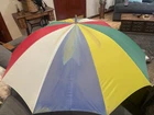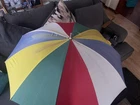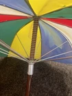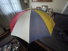 This is a large golf umbrella with a multicolored rainbow pattern, featuring an oversize design and a wood handle. It is made of nylon for waterproof protection and wood for a stylish touch. This unisex umbrella is size L and perfect for adding a fun and vibrant touch to your rainy day ensemble.