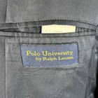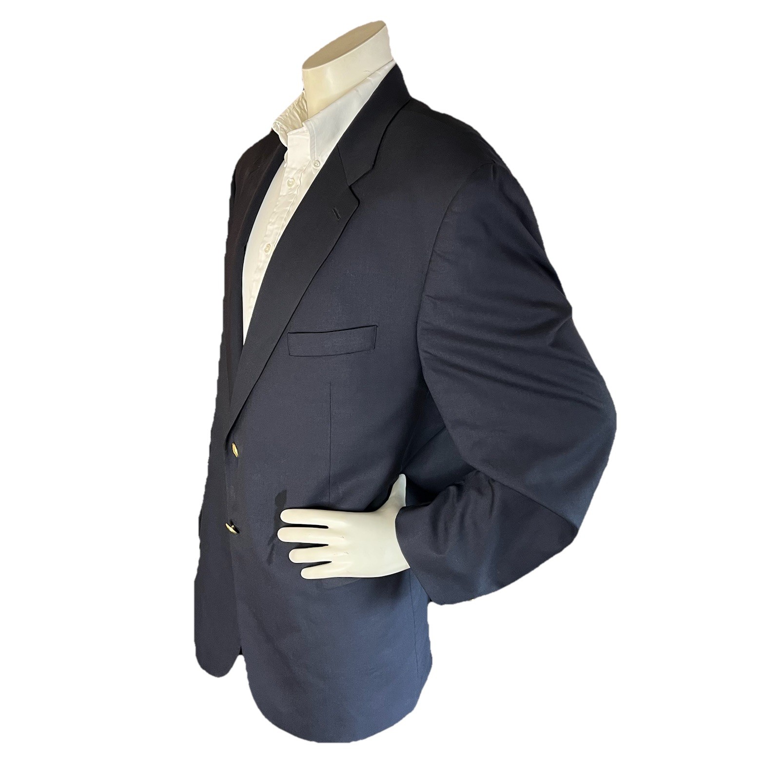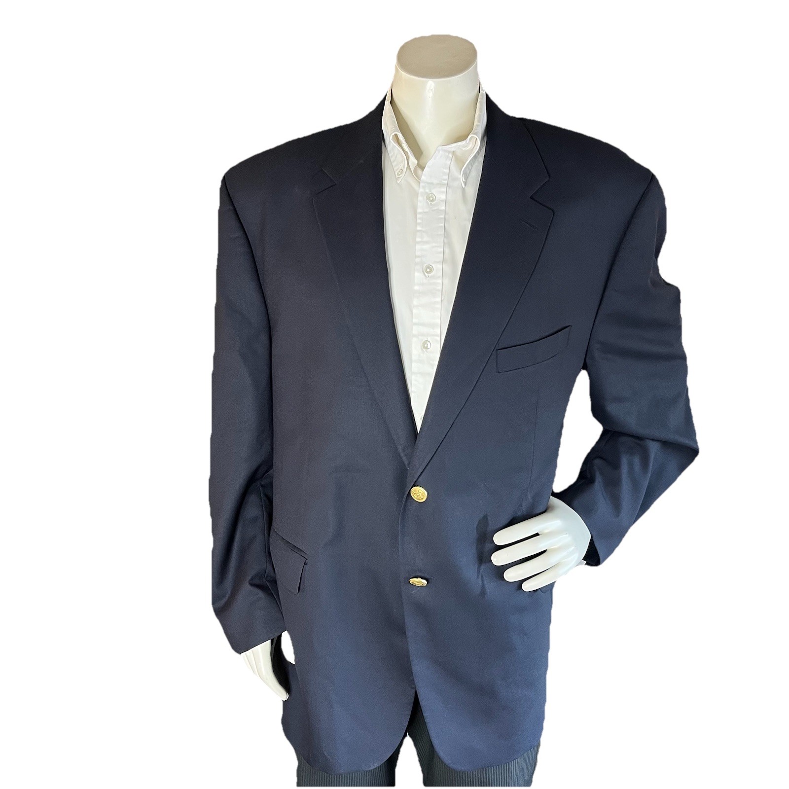 This vintage Polo University Club Ralph Lauren wool blazer in navy blue features gold buttons and a sportcoat style, making it a classic and elegant choice for various occasions such as parties, casual outings, and business meetings. With a size 50R fit and four-button sleeve style, this blazer is perfect for the winter, fall, and spring seasons. The blazer also includes inner pockets, a notch lapel, single vented back, and should be dry cleaned for maintenance. Crafted from high-quality wool with a polyester lining, this designer piece embodies a timeless preppy look with a touch of 80s and 90s style.