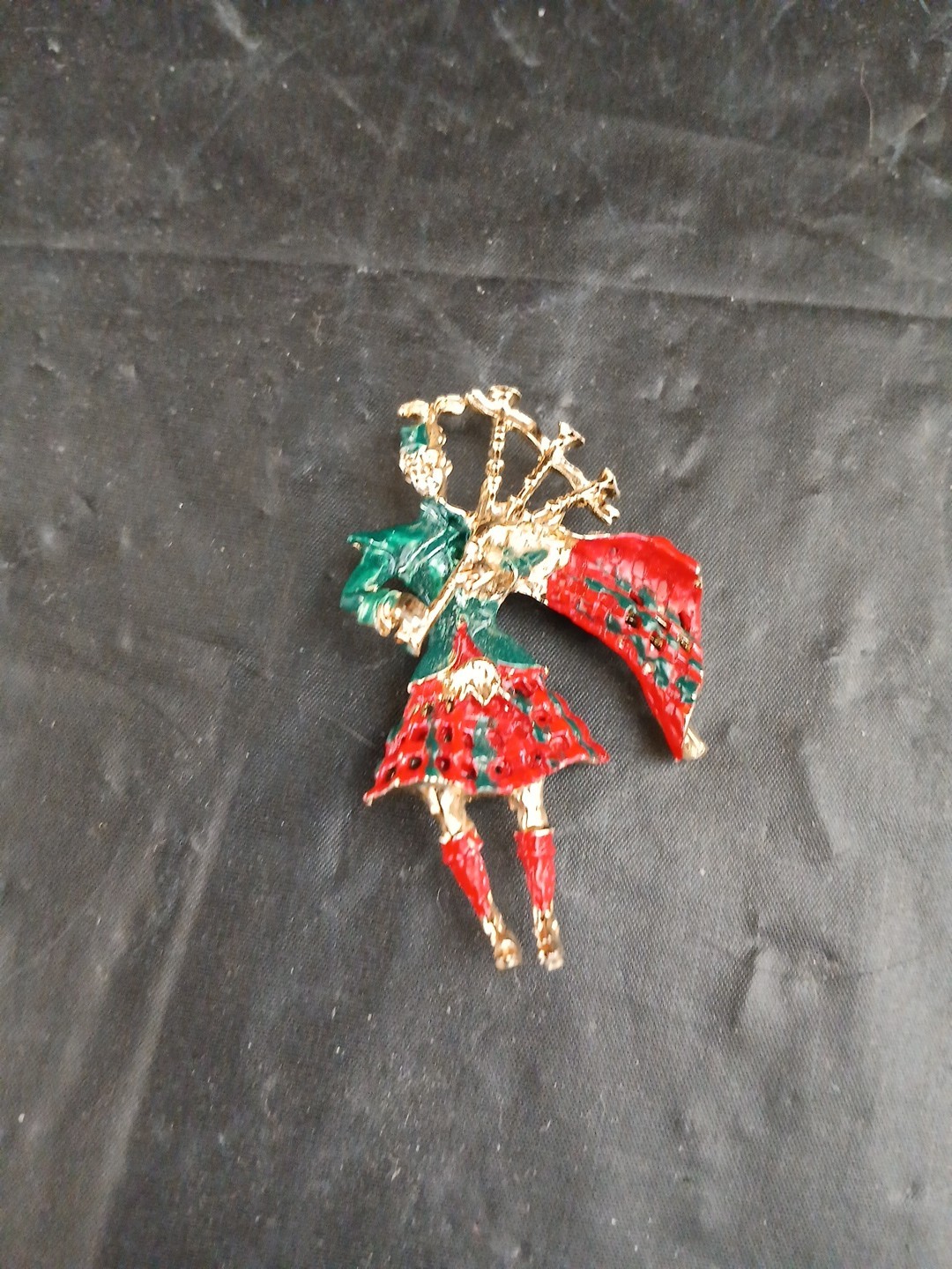 The Vtg Scottish Bagpiper Brooch is a vintage accessory that features a charming design of a bagpiper, likely with a Scottish theme. This brooch is a unique piece of jewelry that can be worn as a pin on clothing or accessories to add a touch of history and heritage to the wearer's ensemble. Perfect for those who appreciate vintage and antique jewelry, this brooch is a timeless addition to any collection.