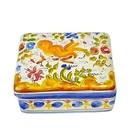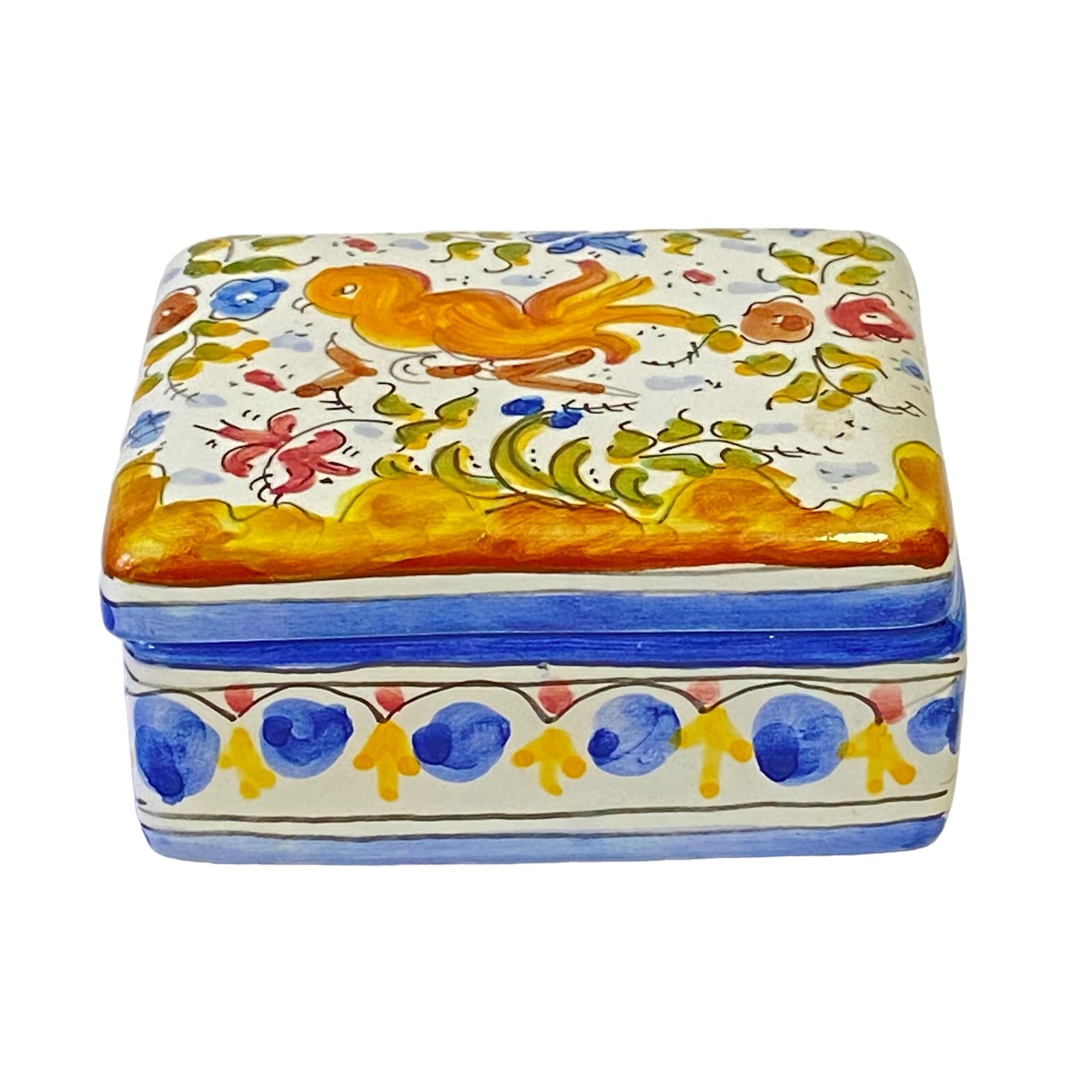 Vintage Frazarte Portugal Hand Painted Vanity Trinket Jewelry Box Birds Flowers Looks to be Talavera type pattern Lovely multicolored decoration of bird and flowers Lidded box Measures approximately: 3 1/2" x 2 3/4" x 1 3/4" In excellent condition. No chips or cracks.
